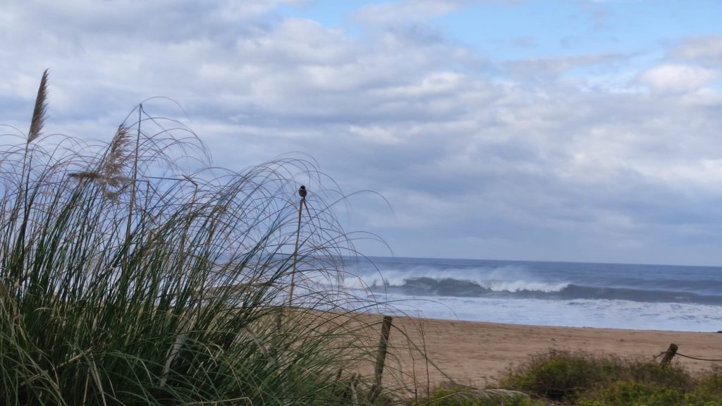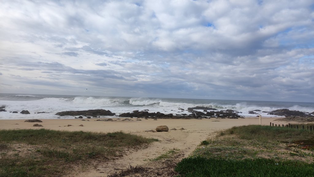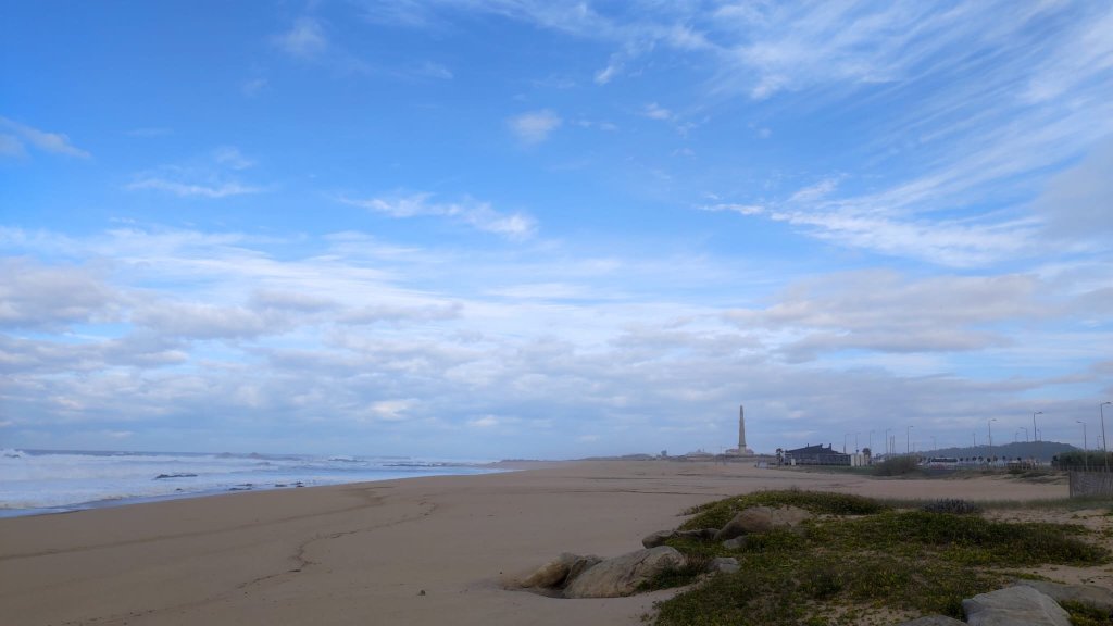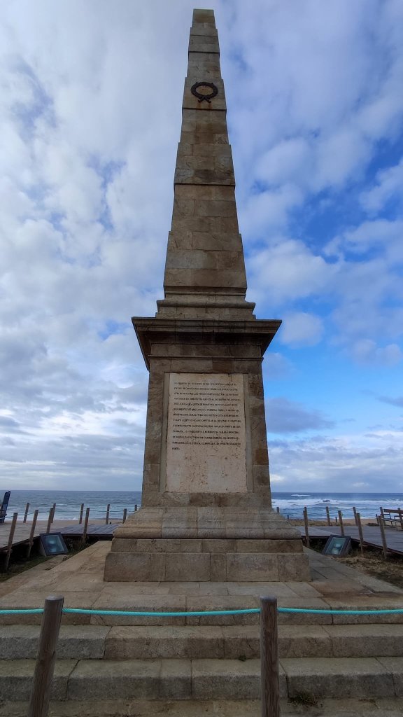 Comenzamos a caminar por las pasarelas que salvaban las dunas de la etapa anterior y con el imponente obelisco de la Memoria presente en el horizonte. La mañana está bastante fresca, el Atlántico está algo más embravecido que ayer y negros nubarrones se avistan en el horizonte. El primer hito con el que nos encontramos es con la Playa de la Memoria, un extenso arenal en el que en 1832 las tropas del antiguo rey Pedro IV desembarcaron para enfrentarse al usurpador del reino Miguel, en el contexto de la Guerra Civil Portuguesa (1828 – 1834). Para conmemorar este desembarco se erigió un colosal obelisco declarado monumento nacional en 1880. El camino discurre por una amplia zona dunar, siempre sobre pasarelas de madera que nos llevan de playa en playa siempre con el Atlántico bramando a nuestro lado.