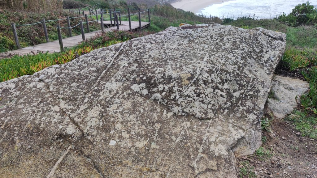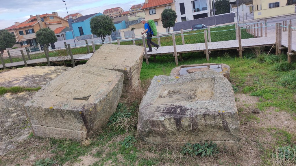 En el km 5,8 llegamos a la playa de Angueiras con un recoleto poblado de pescadores y los restos de una antigua factoría romana de salazones con media docena de piletas excavadas y otras tantas por excavar, rodeadas del típico empedrado portugués y las construcciones de los pescadores destinadas a albergar las herramientas empleadas para la pesca. Poco más adelante nos acercamos a un bonito puente de madera que salva el Río Onda con su desembocadura llena de gaviotas, correlimos y otras aves lacustres entre la que destacan las lavanderas blancas. Continuan las pasarelas por la playa y nos acercamos a conocer las Runas de San Paio con grabados rupestres en una falla, Os Penedos amoladoiros, una piedra en la que se aprecian rastros de afilado de lanzas, los restos del Castro de San Paio y la ermita dedicada al santo. Hay un centro de interpretación (cerrado en esta época)
