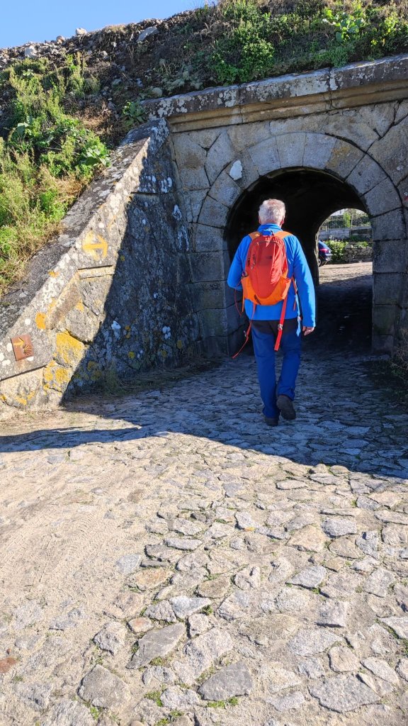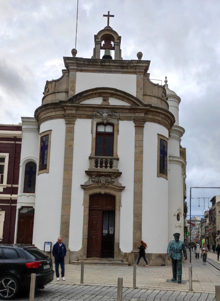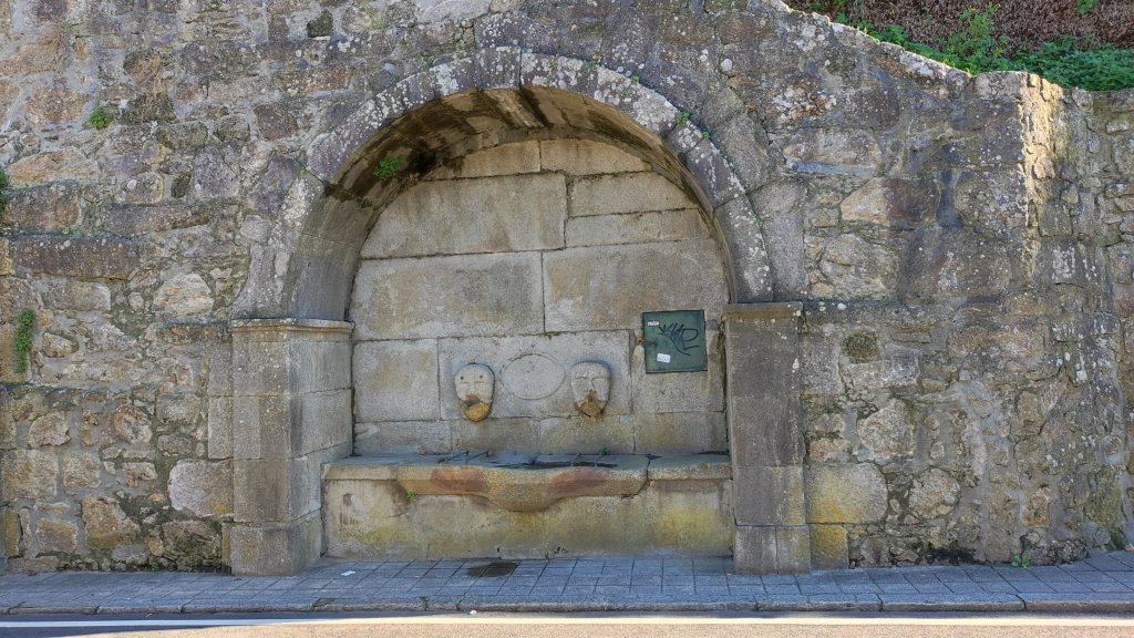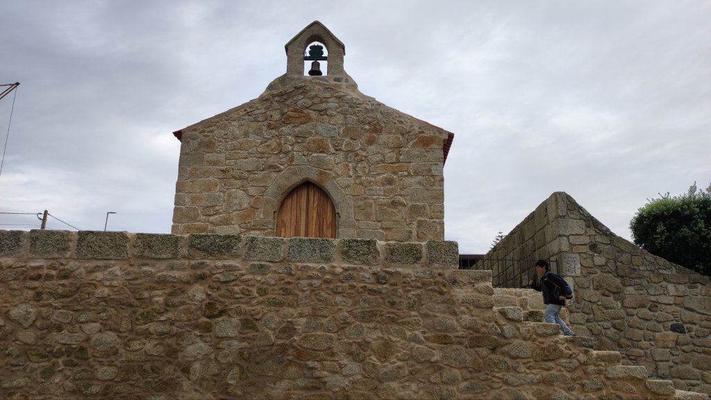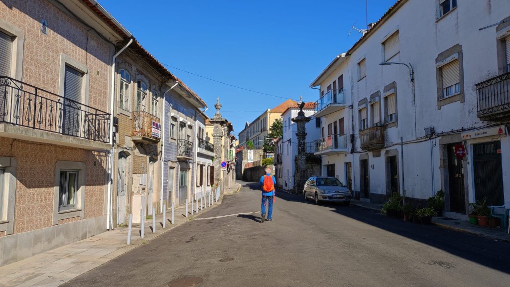 Continuamos por una carretera empedrada con muy poco tráfico en dirección a Outeiro y Belinhos. Desde cierta distancia ya oteamos la silueta de La Iglesia de San Pedro. Remodelada a finales del S. XIX, sigue el canon de otras muchas del norte de Portugal, con fachada blanca y molduras de granito con la torre rematando en cúpula bulbosa. Más adelante nos encontraremos con la capilla de San Amaro muy sencilla y con espacio para descansar. Desde el barrio de Santo Amaro el camino se encajona entre grandes muros de quintas agrícolas hasta la entrada de A Estrada donde veremos una escultura de Santiago Apóstol esculpida sobre un bloque de mármol traído expresamente desde Galicia tratando de reforzar la conexión de este camino con los gallegos.