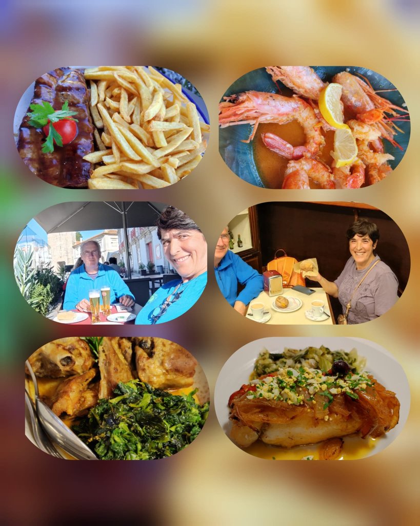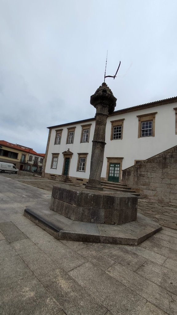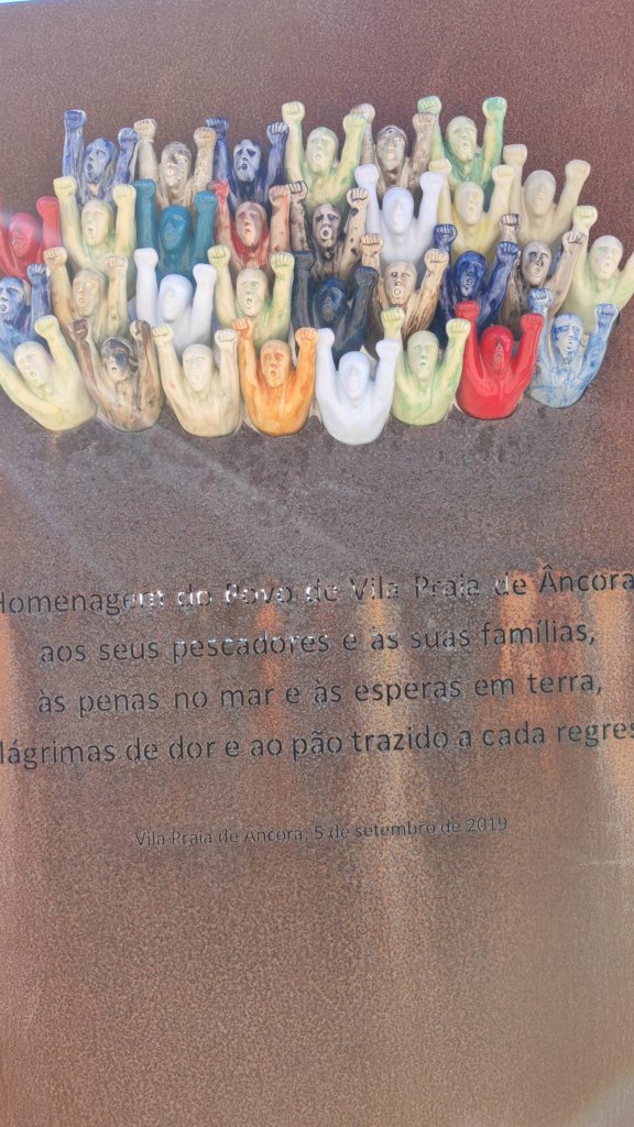 Al final de la Calle una rotonda con una escultura homenaje a los pescadores. Otra calle larguísima nos adentra en la freguesía de Cristelo con una Alminha hacia la mitad, nombradas como Alminhas do Camarido. Un poco más adelante pasamos ante la Capilla de Nossa Sra da Agonia y un par de columnas historiadas nos dan paso a Caminha. Callejeamos ante la enésima estatua homenaje a los pescadores y llegamos a la Plaza Conselheiro Silva Torres donde admiramos la bonita arquitectura que la rodea: La torre del reloj, la Igrexia Matriz y el teatro. Por la rúa Cons. Miguel Dantas accedemos a un paso subterráneo que nos deja ante el embarcadero. Es la hora de comer y el barquero tiene un compromiso de paseo por el río Miño en media hora. Buscamos un buen restaurante, no nos cuesta mucho, y damos por terminado este tramo del Camino Portugués a Santiago por la costa. En cuanto tengamos algunos días disponibles terminaremos la parte española de este camino.