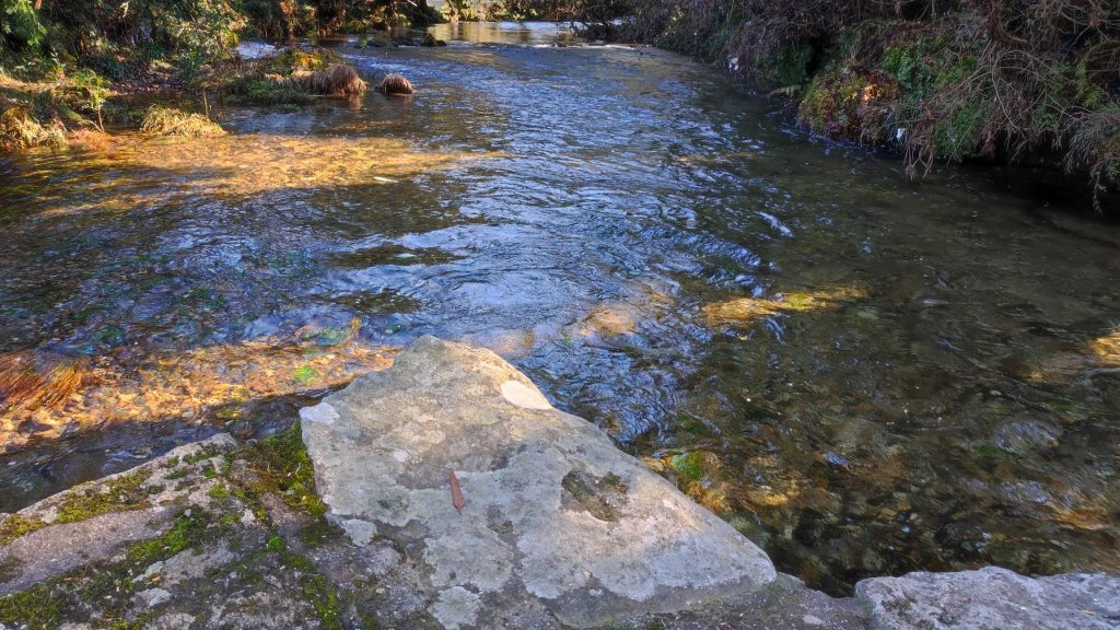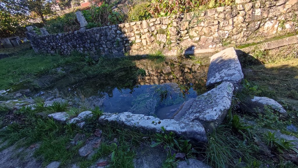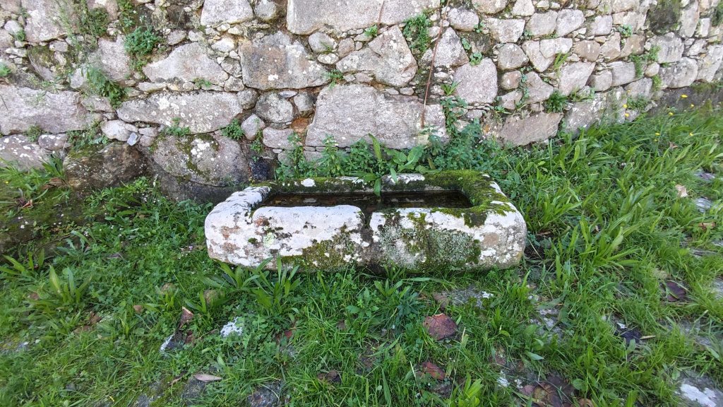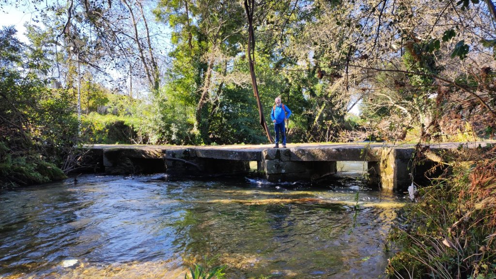 Al comienzo del Caminho da Torre hay un área recreativa con fuente, un peto o alminha en forma de capillita y un perrete que nos acompaña alegremente hasta el Río Áncora. El río Áncora baja bastante caudaloso pero lo cruzamos sin dificultad por el puente da Torre, un sencillo pero sólido puente de piedra sin antepecho ni florituras. Nada más cruzar el río el perro que nos acompaña se vuelve hacia Áncora y encontramos el camino completamente inundado por las aguas del arroyo das Escadas. A la derecha del camino hay una casita de piedra con dos escalones que nos permiten subir a un terreno cultivado por encima del nivel del camino y siguiendo la linde conseguimos salvar el problema del agua.