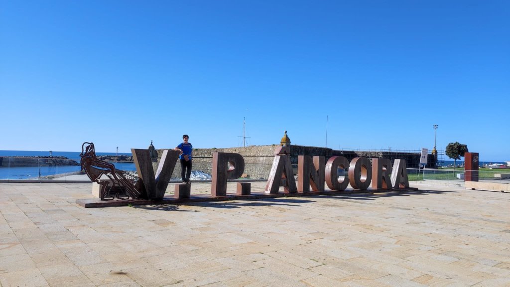 A menos de un km llegamos a las primeras casas de Vila Praia de Áncora, una freguesía de casitas de pescadores en origen y ahora un centro de turismo playero. Cruzamos el núcleo y pasamos por la praza con la Capilla de Nossa Senhora da Bonança. Edificada a finales del S. XIX, esta capilla acabada en estilo neoclásica presenta un aspecto imponente en relación con las casitas que la rodean. La calle que sale de la plaza de la capilla desemboca en pleno paseo marítimo con numerosos cafés y el fuerte da Lagarteira, del siglo XVII con un gran escudo real coronando la puerta principal (ahora en obras). Nos hacemos unas fotos en la letras en acero corten que forman el nombre de la villa, pasamos ante un monumento homenaje a los pescadores y sus mujeres y tomamos un café antes de proseguir la caminata.