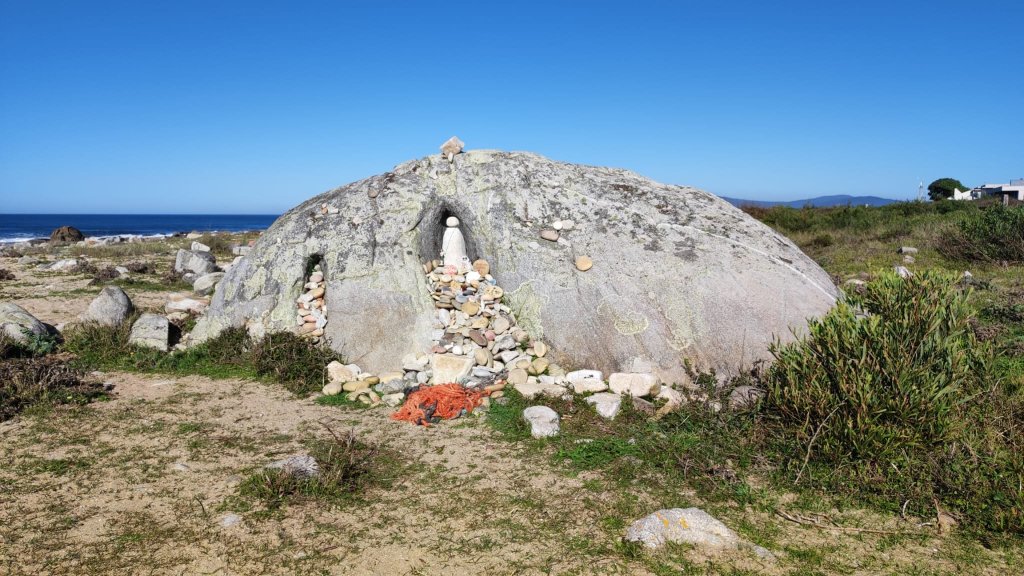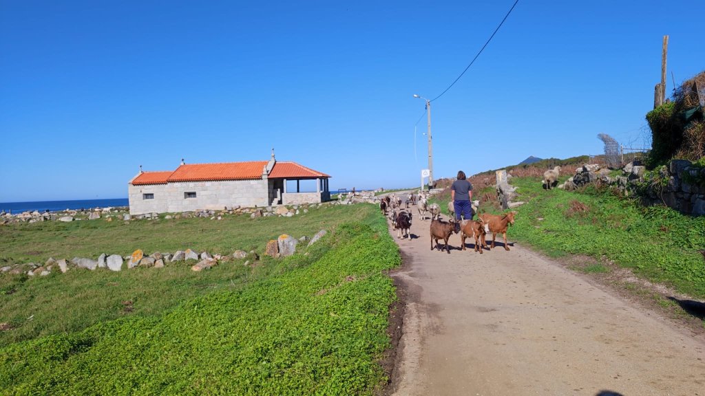 A partir de este punto nuestro camino tiene al Océano Atlántico como acompañante. Hoy está muy sosegado y la marea baja deja a la vista piscinas y enormes bloques de piedra. El paseo cuenta con diversos elementos decorativos como soportes con vidrios coloreados, claves de sol, bancos y medias barquitas usadas también como bancos para contemplar las puestas de sol y el vaivén de las olas. Poco más adelante llegamos al paraje en el que se encuentra la Capilla de San Isidoro. Nuestra llegada coincide con la llegada de un rebaño de ovejas y cabras que pasan por un partidero en el que el pastor las va clasificando. En este punto justo comienza el último tramo de la Ecovía Litoral, por lo que la caminata torna en paseo. Al fondo ya podemos atisbar el Monte Tecla, en la orilla española y en primer término una gran playa repleta de surfistas. Junto a la playa la freguesía de Moledo con una única y larguísima calle con casas más o menos señoriales a ambos lados.