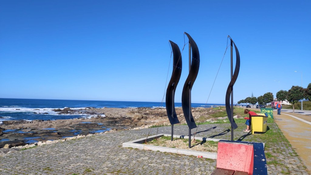 Continuamos nuestro caminar con el Atlántico a nuestra izquierda y pasamos bajo la hermosísima Pérgola da Foz de inicios del siglo XX, un precioso balcón sobre la playa do Molhe y pórtico de un parque con las esculturas del salvavidas, homenaje a los que salían a salvar vidas en medio de la tempestad y el Hombre del timón, escultura que rinde homenaje a los pescadores. Finalmente llegamos a una rotonda en la que se encuentra el Fuerte de San Francisco Javier y la estatua ecuestre de D. Joao VI. Esta rotonda marca el final de Oporto, también es la meta de la maratón y el comienzo de la playa de Matosinhos con una instalación, la Anémona, una red roja muy colorida.