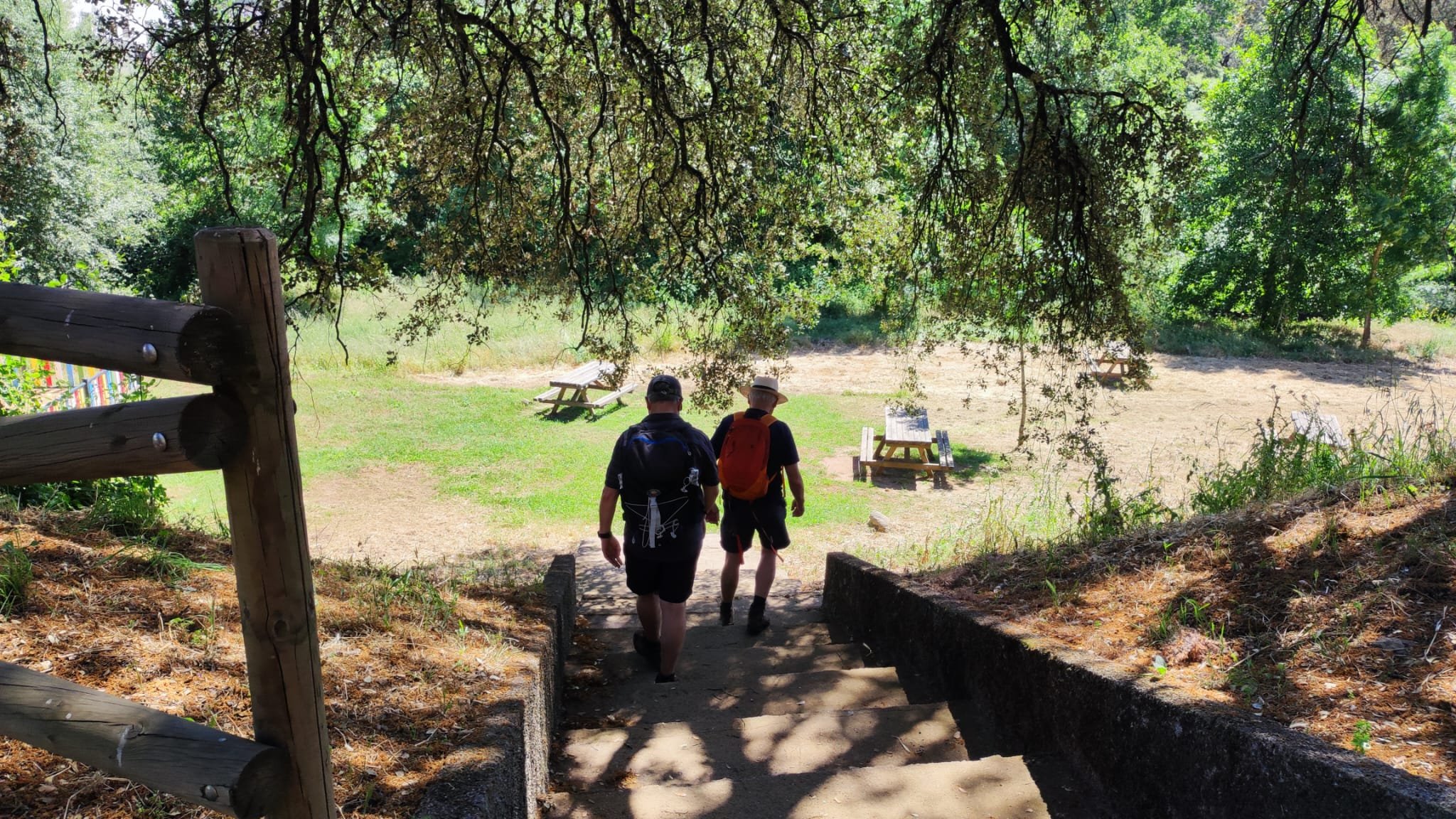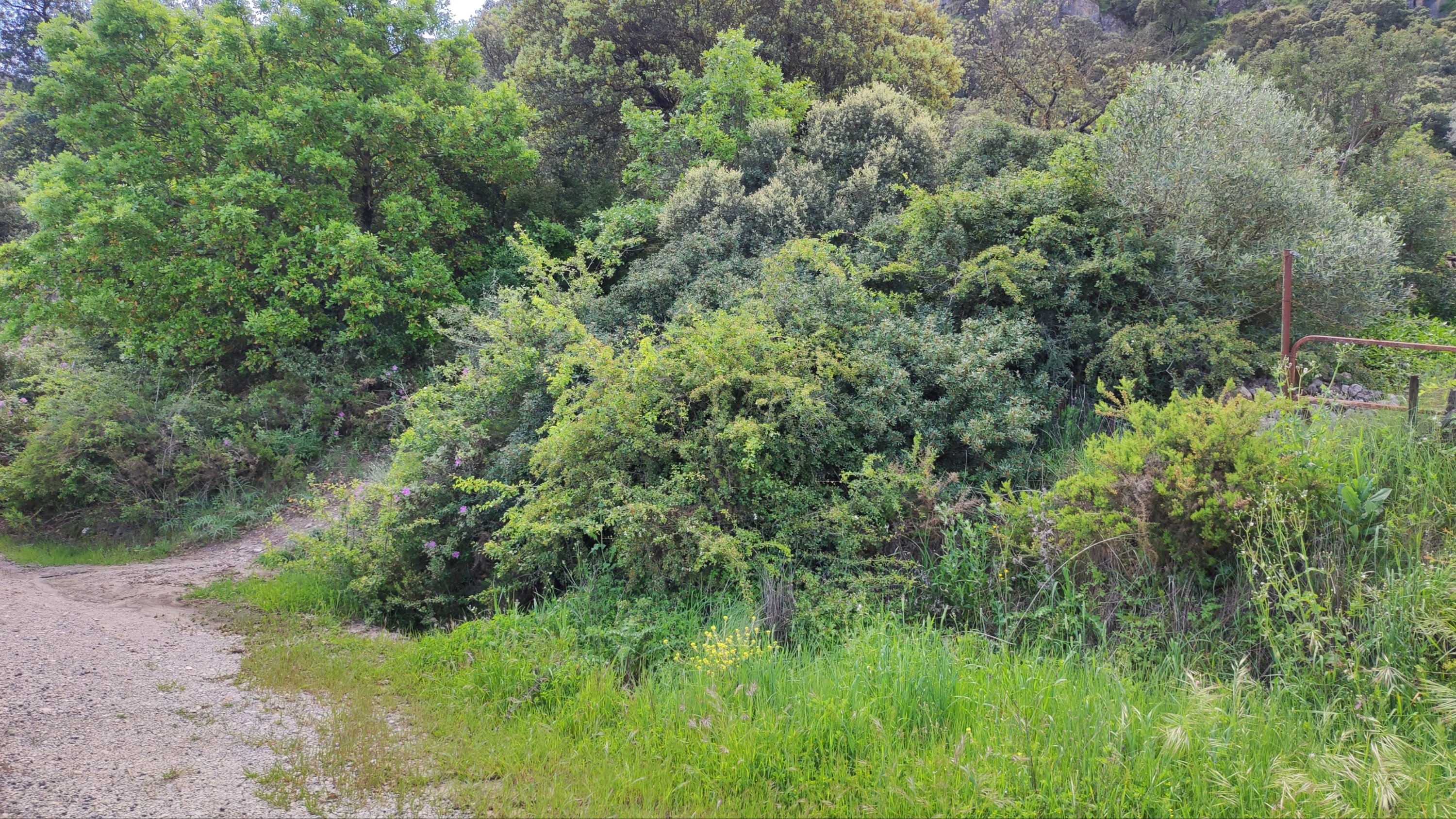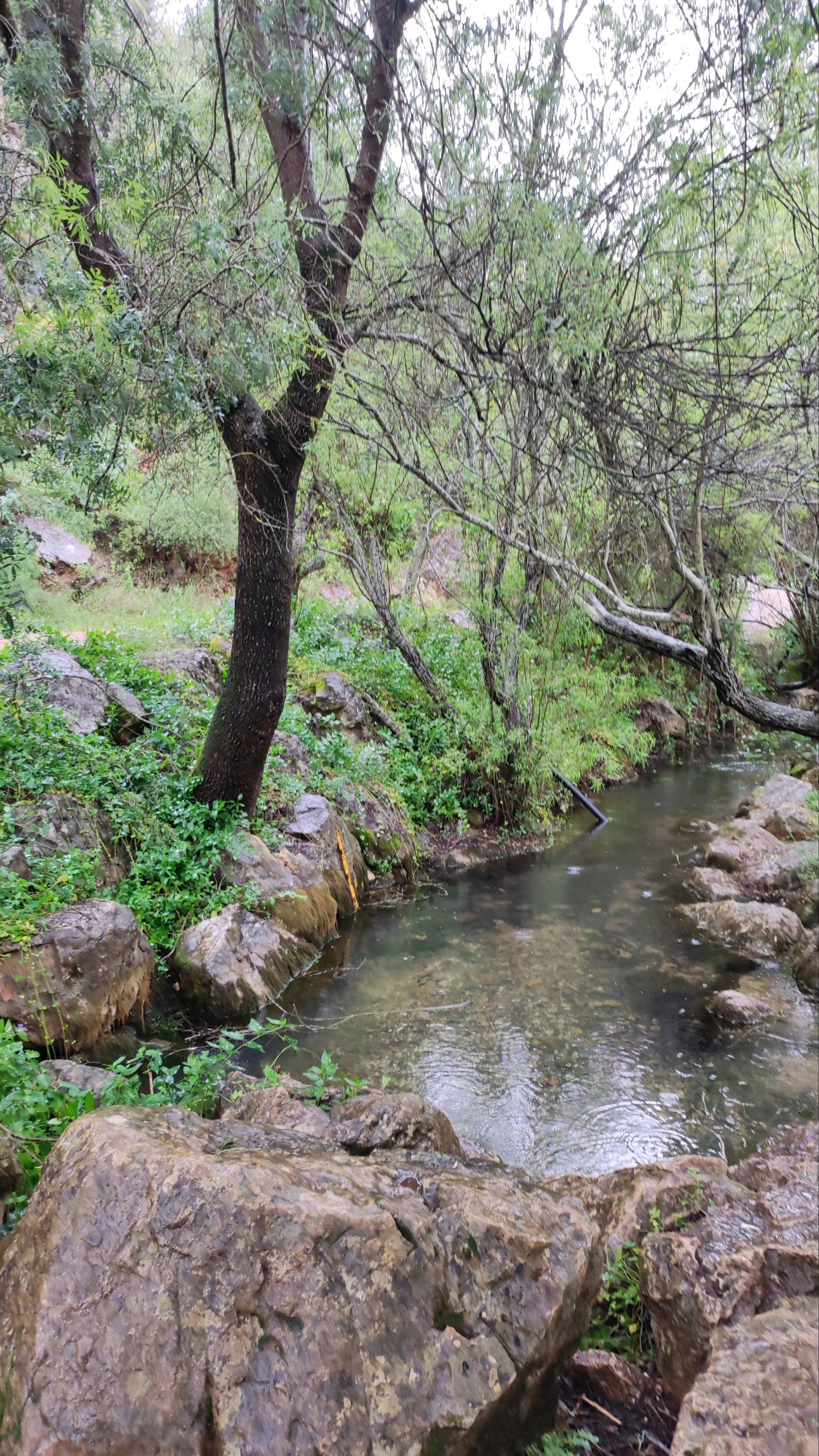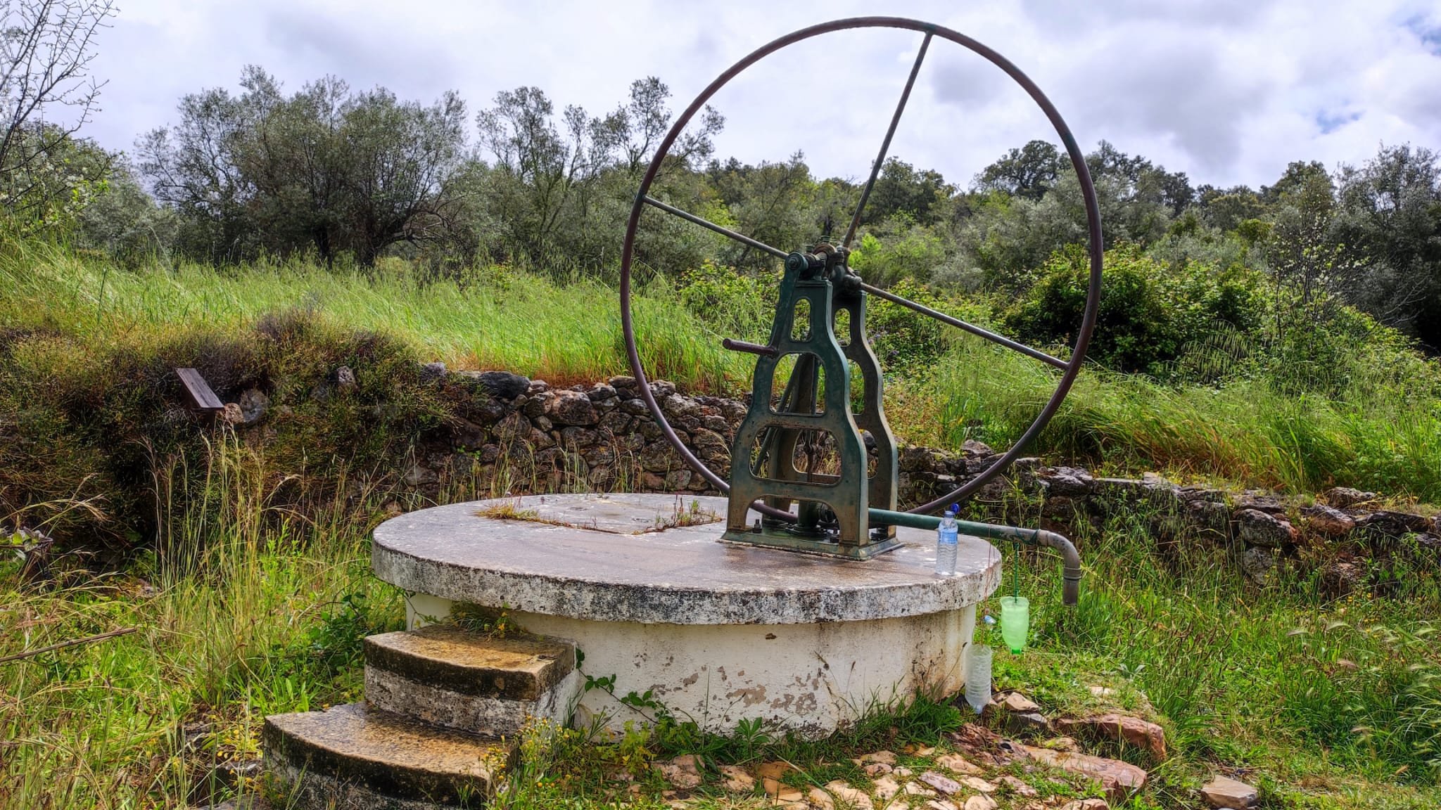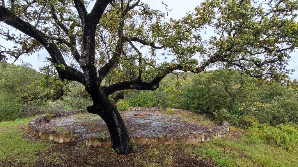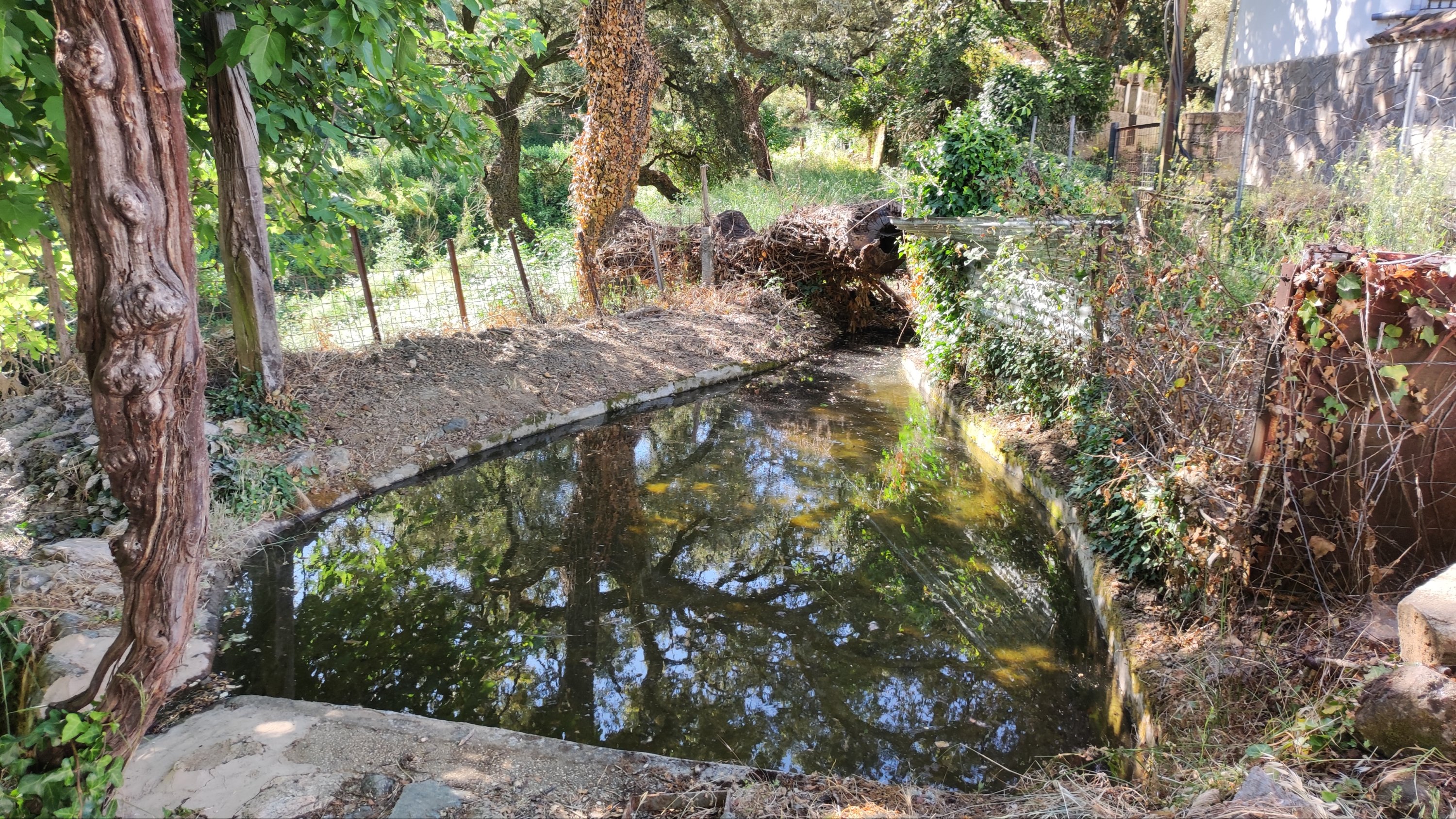 A partir de este punto seguimos un estrecho sendero junto a las aguas del embalse de derivación entre una vegetación propia del bosque mediterráneo mediatizada por presencia de las aguas del embalse. La encina es el árbol más abundante, junto con los acebuches, los jarales y algunos eucaliptus de gran porte. Entre la fauna, vemos algunos buitres leonados, alguna cigüeña negra y el canto de los jilgueros y el arrullo de las palomas. Es tierra de linces, pero lo frecuentado del sendero hace imposible su avistamiento. Hacia el km 5 de nuestro camino llegamos a la fuente de la amistad, el amor y la suerte que marca el comienzo de la pequeña ascensión. Es una fuente con tres caños nombrados de la amistad, del amor y de la suerte. Hoy no era el día del amor ya que de ese caño no manaba agua.