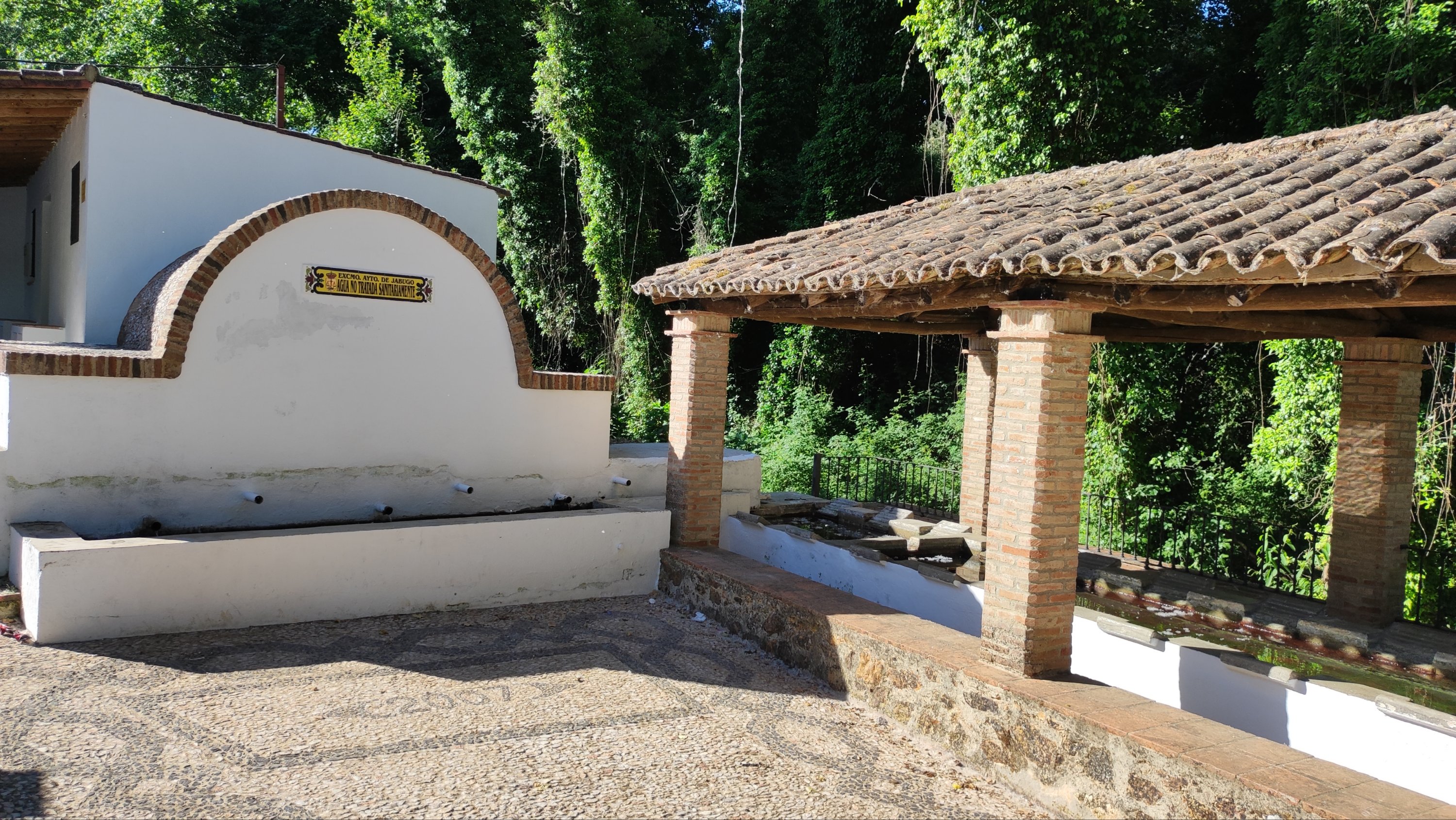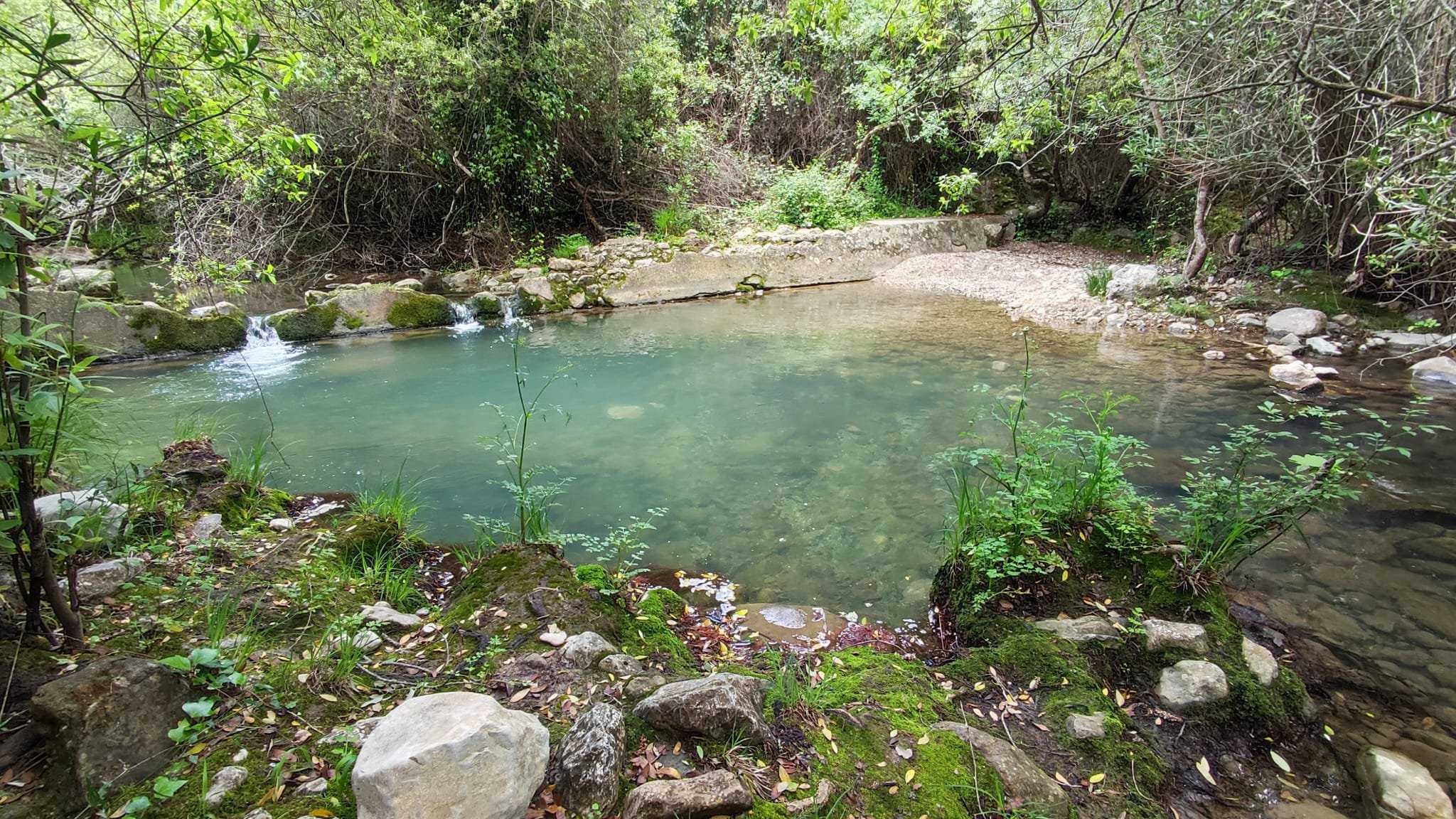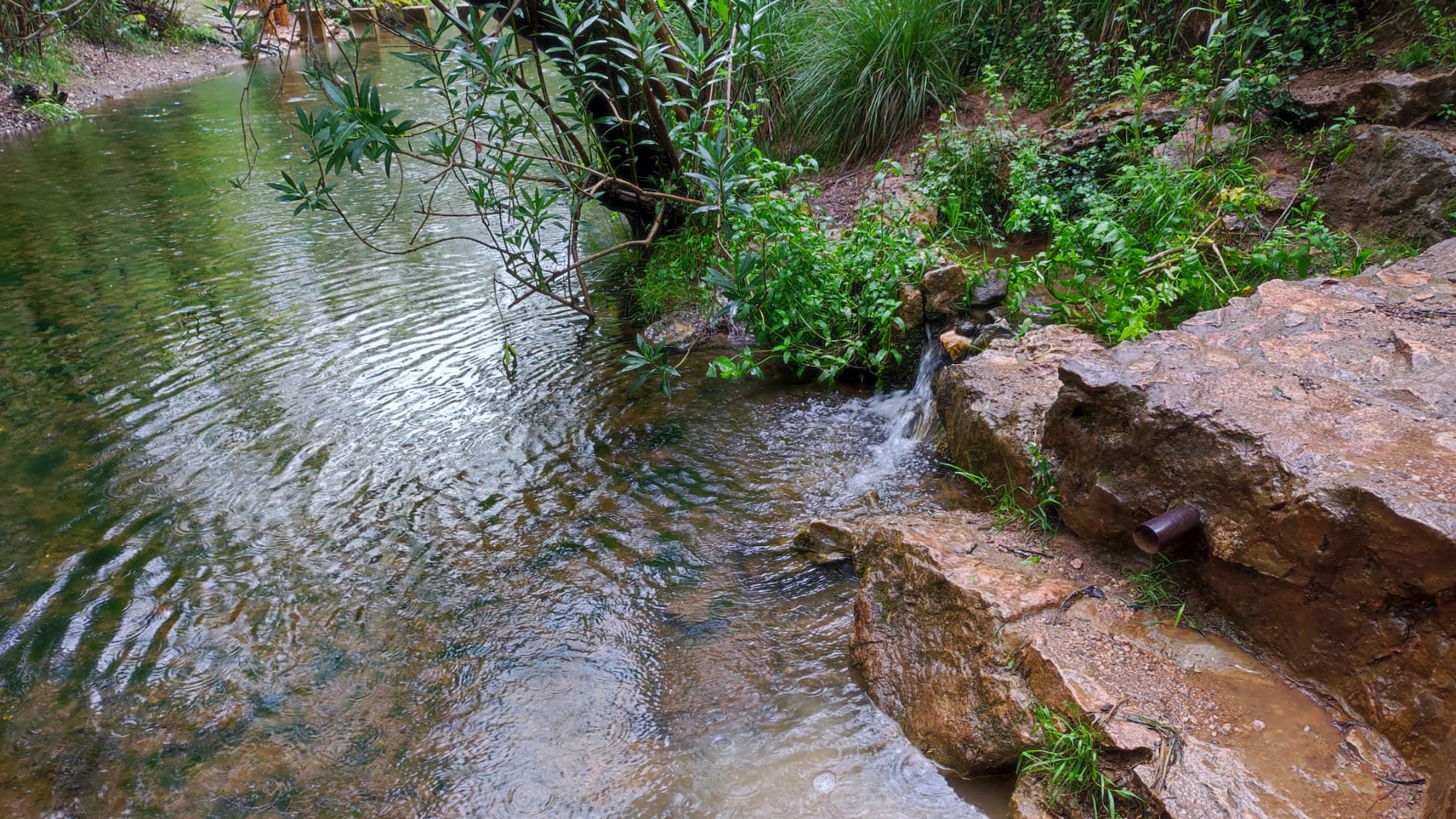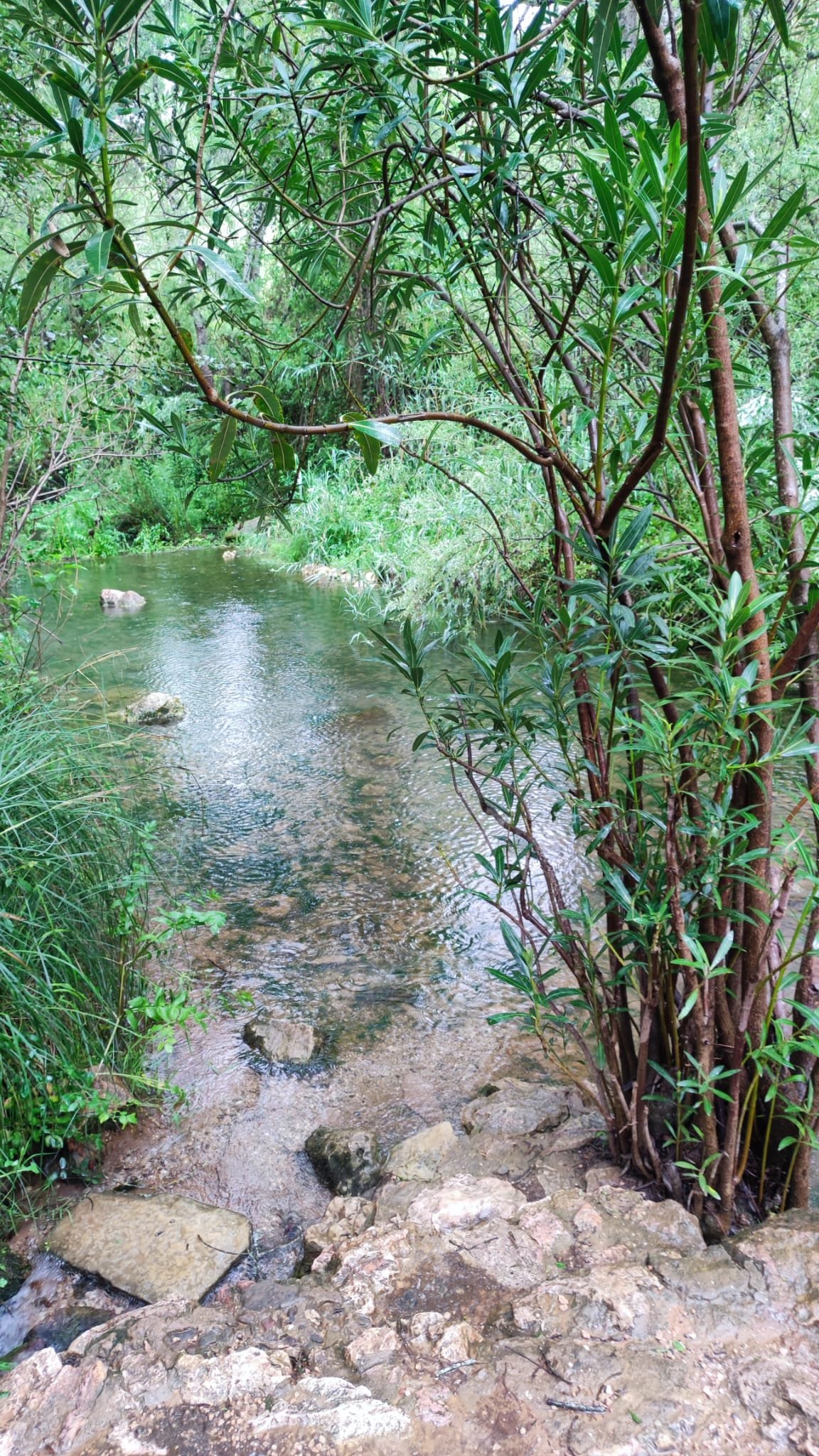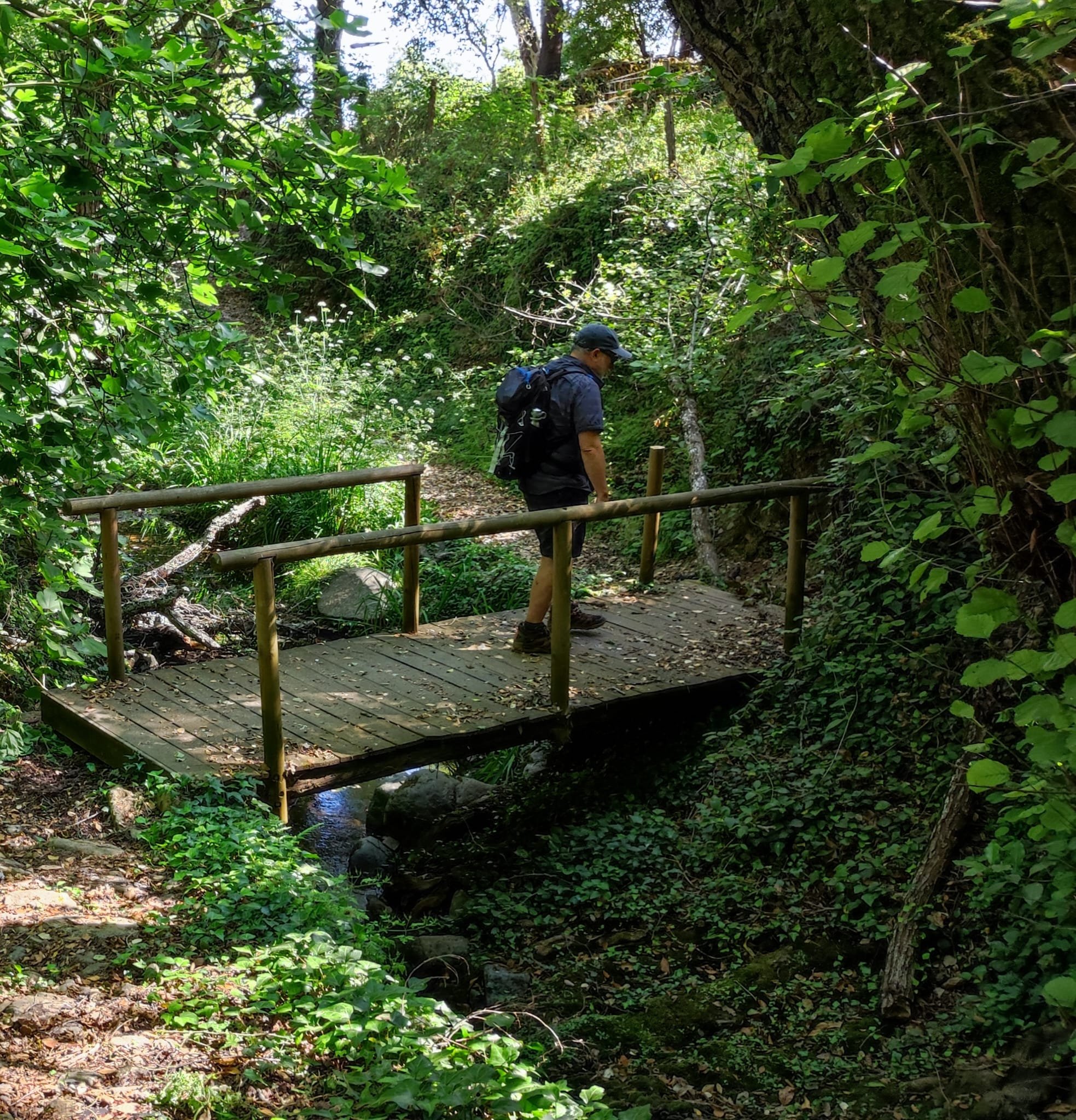 A partir de este punto seguimos un estrecho sendero junto a las aguas del embalse de derivación entre una vegetación propia del bosque mediterráneo mediatizada por presencia de las aguas del embalse. La encina es el árbol más abundante, junto con los acebuches, los jarales y algunos eucaliptus de gran porte. Entre la fauna, vemos algunos buitres leonados, alguna cigüeña negra y el canto de los jilgueros y el arrullo de las palomas. Es tierra de linces, pero lo frecuentado del sendero hace imposible su avistamiento. Hacia el km 5 de nuestro camino llegamos a la fuente de la amistad, el amor y la suerte que marca el comienzo de la pequeña ascensión. Es una fuente con tres caños nombrados de la amistad, del amor y de la suerte. Hoy no era el día del amor ya que de ese caño no manaba agua.