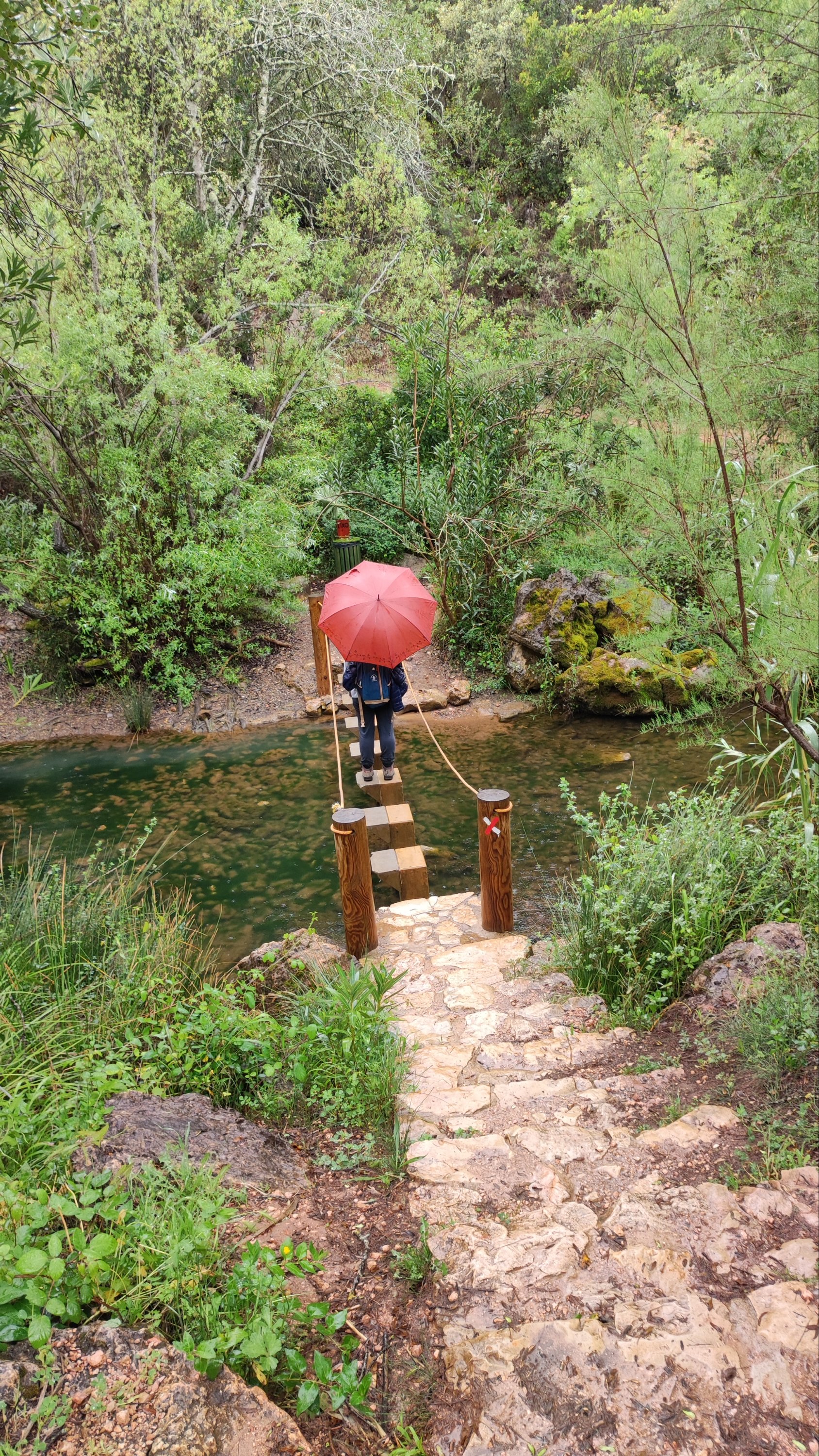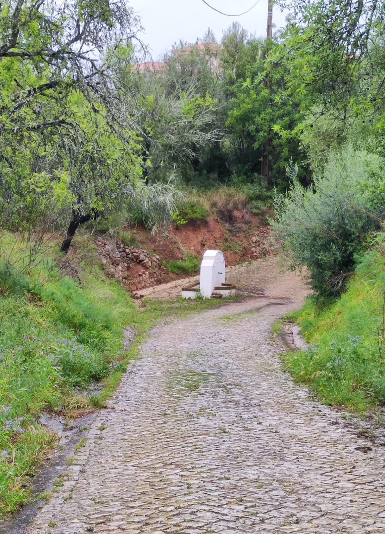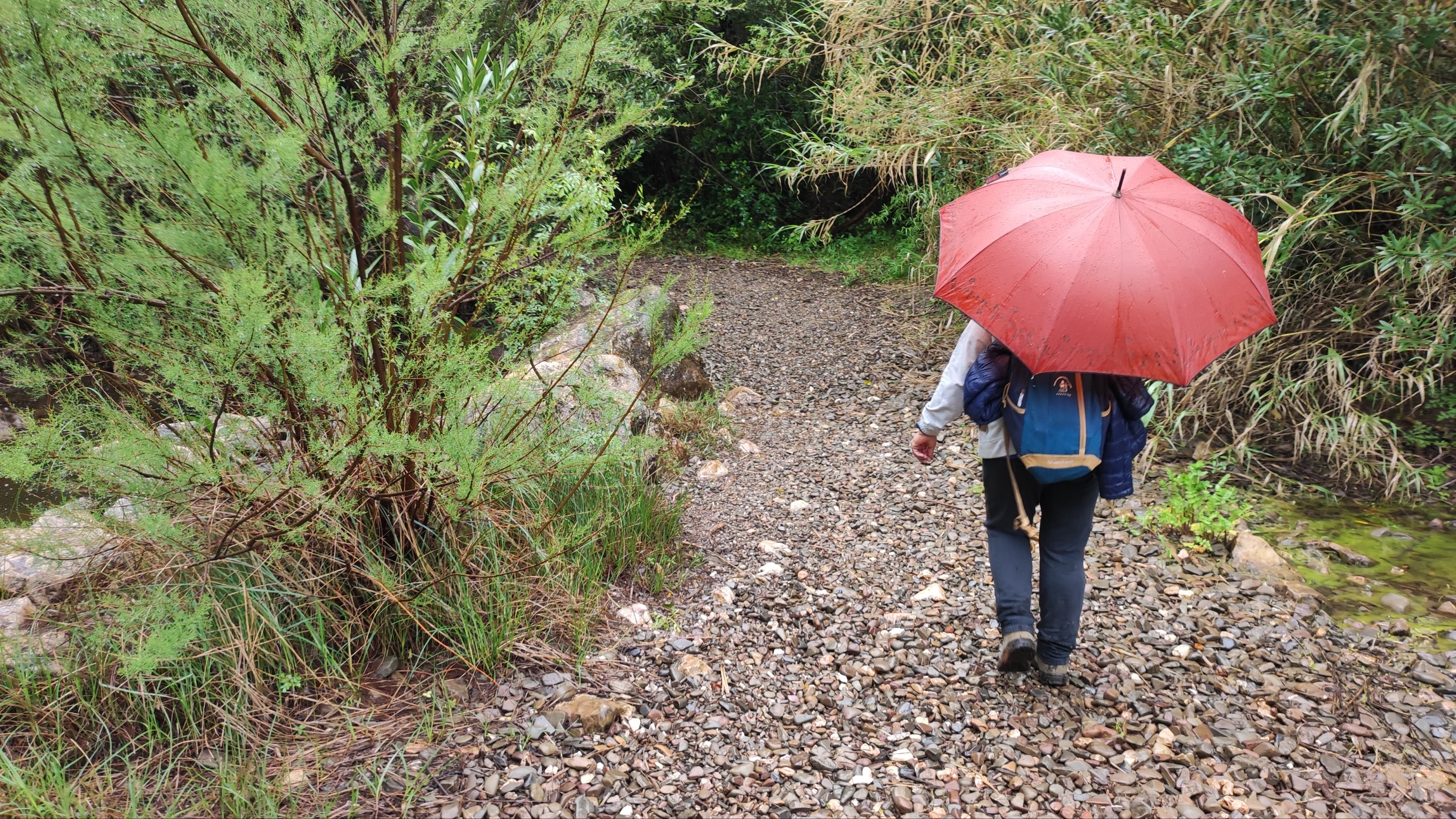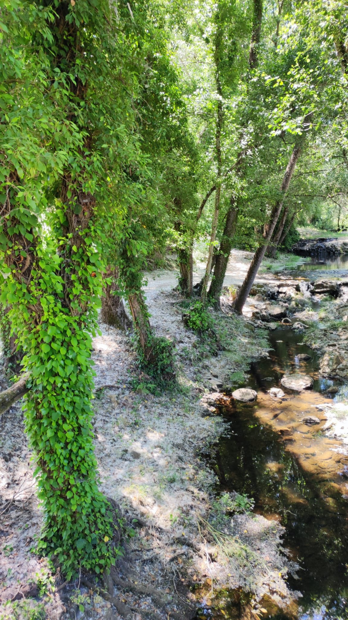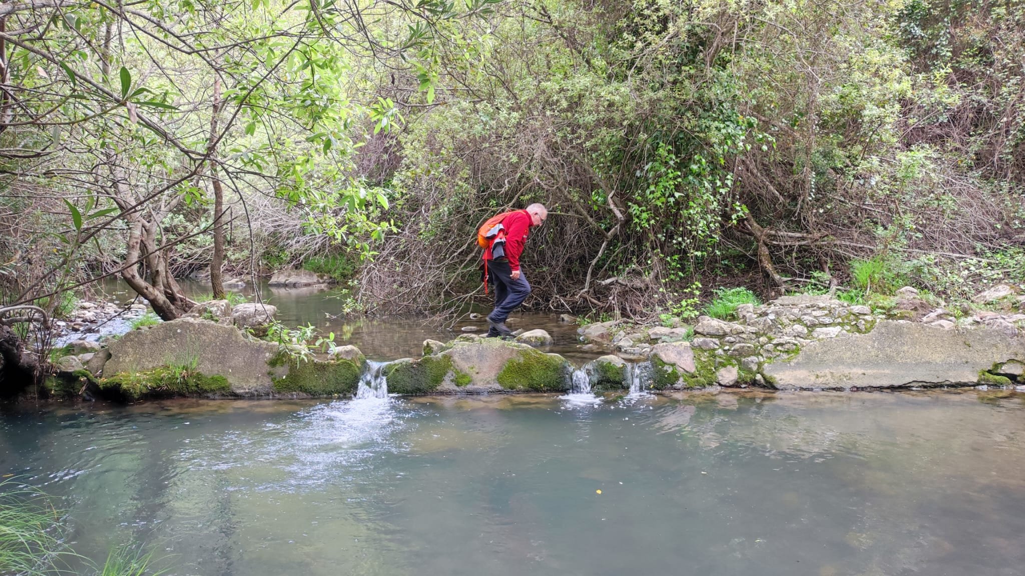 A partir de este punto seguimos un estrecho sendero junto a las aguas del embalse de derivación entre una vegetación propia del bosque mediterráneo mediatizada por presencia de las aguas del embalse. La encina es el árbol más abundante, junto con los acebuches, los jarales y algunos eucaliptus de gran porte. Entre la fauna, vemos algunos buitres leonados, alguna cigüeña negra y el canto de los jilgueros y el arrullo de las palomas. Es tierra de linces, pero lo frecuentado del sendero hace imposible su avistamiento. Hacia el km 5 de nuestro camino llegamos a la fuente de la amistad, el amor y la suerte que marca el comienzo de la pequeña ascensión. Es una fuente con tres caños nombrados de la amistad, del amor y de la suerte. Hoy no era el día del amor ya que de ese caño no manaba agua.