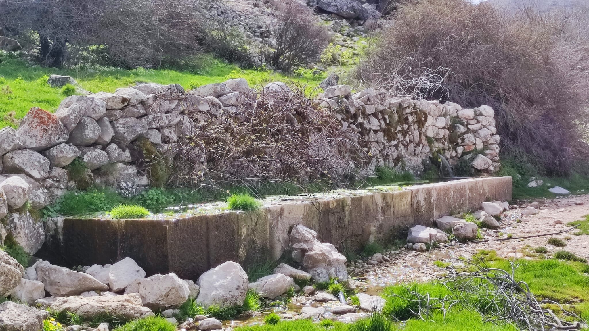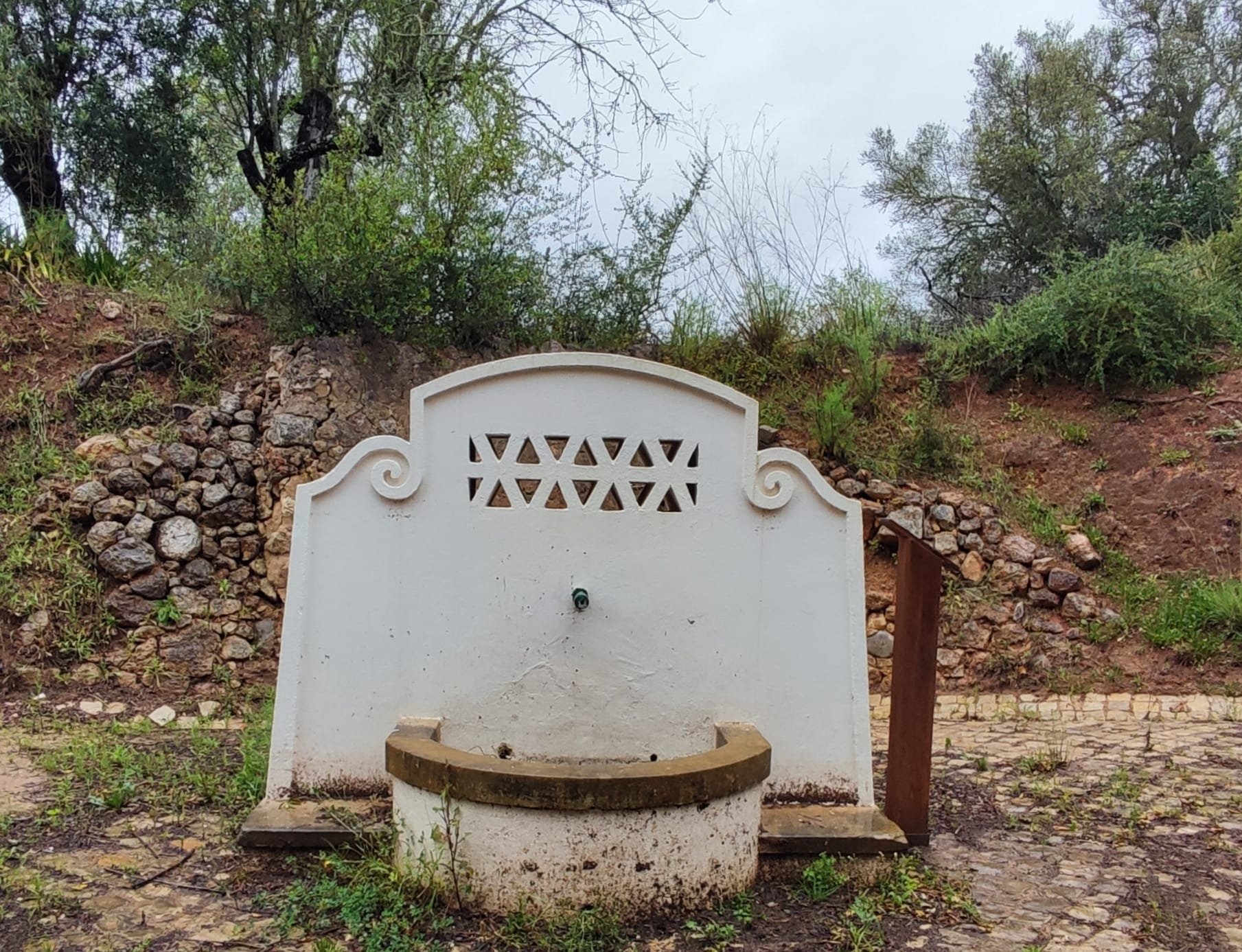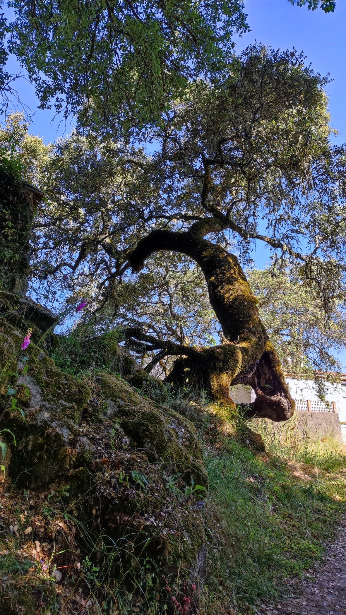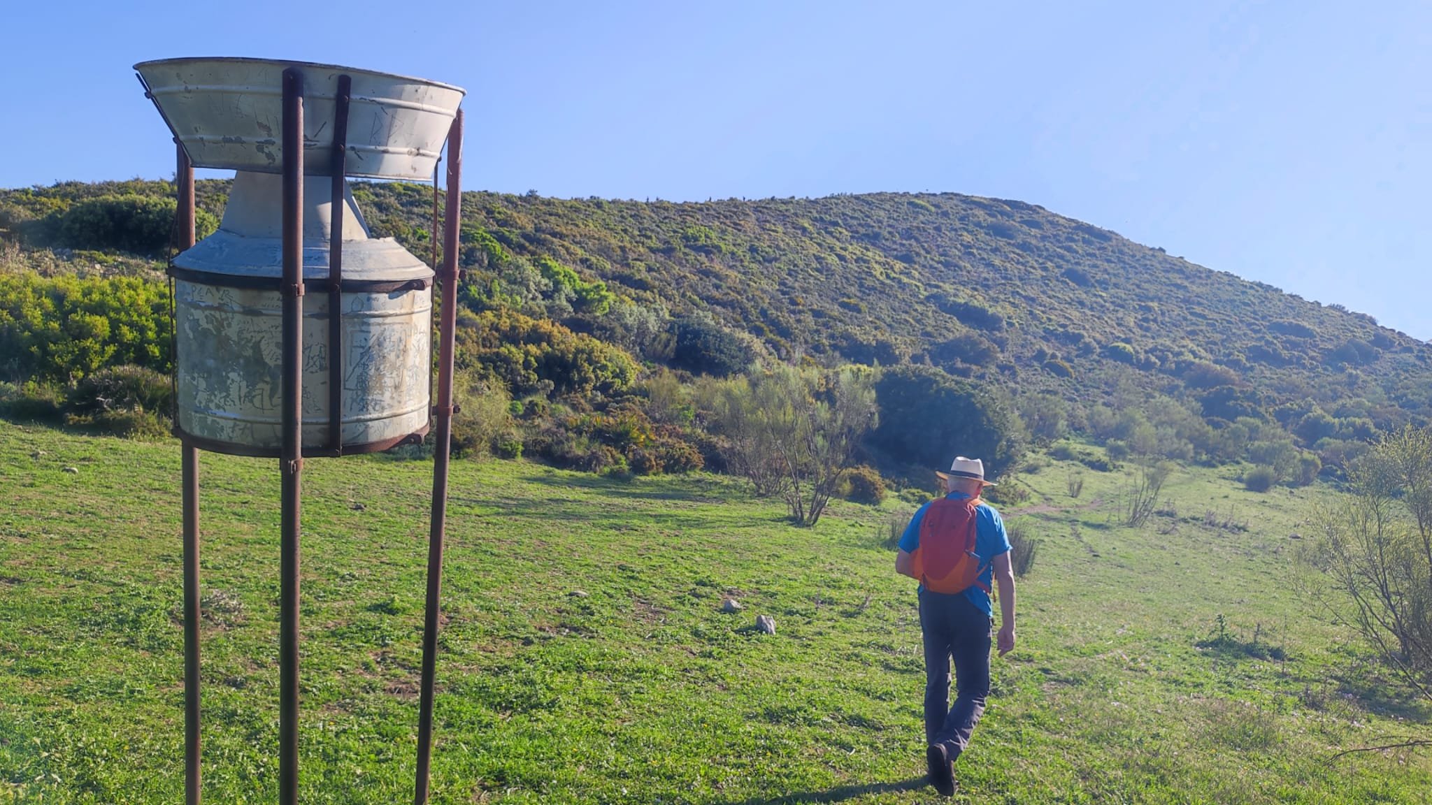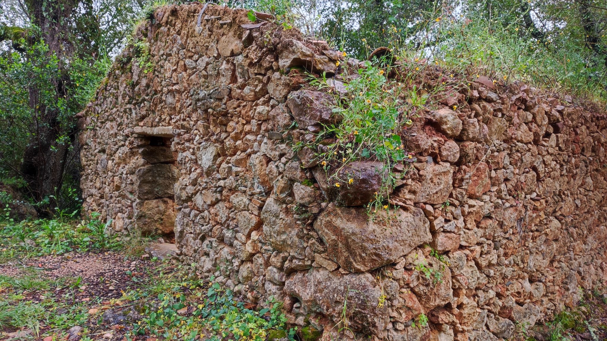A partir de este punto seguimos un estrecho sendero junto a las aguas del embalse de derivación entre una vegetación propia del bosque mediterráneo mediatizada por presencia de las aguas del embalse. La encina es el árbol más abundante, junto con los acebuches, los jarales y algunos eucaliptus de gran porte. Entre la fauna, vemos algunos buitres leonados, alguna cigüeña negra y el canto de los jilgueros y el arrullo de las palomas. Es tierra de linces, pero lo frecuentado del sendero hace imposible su avistamiento. Hacia el km 5 de nuestro camino llegamos a la fuente de la amistad, el amor y la suerte que marca el comienzo de la pequeña ascensión. Es una fuente con tres caños nombrados de la amistad, del amor y de la suerte. Hoy no era el día del amor ya que de ese caño no manaba agua.