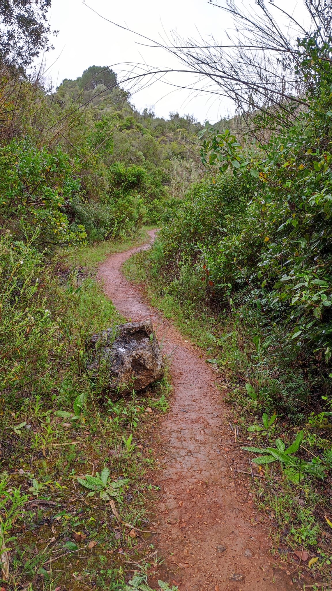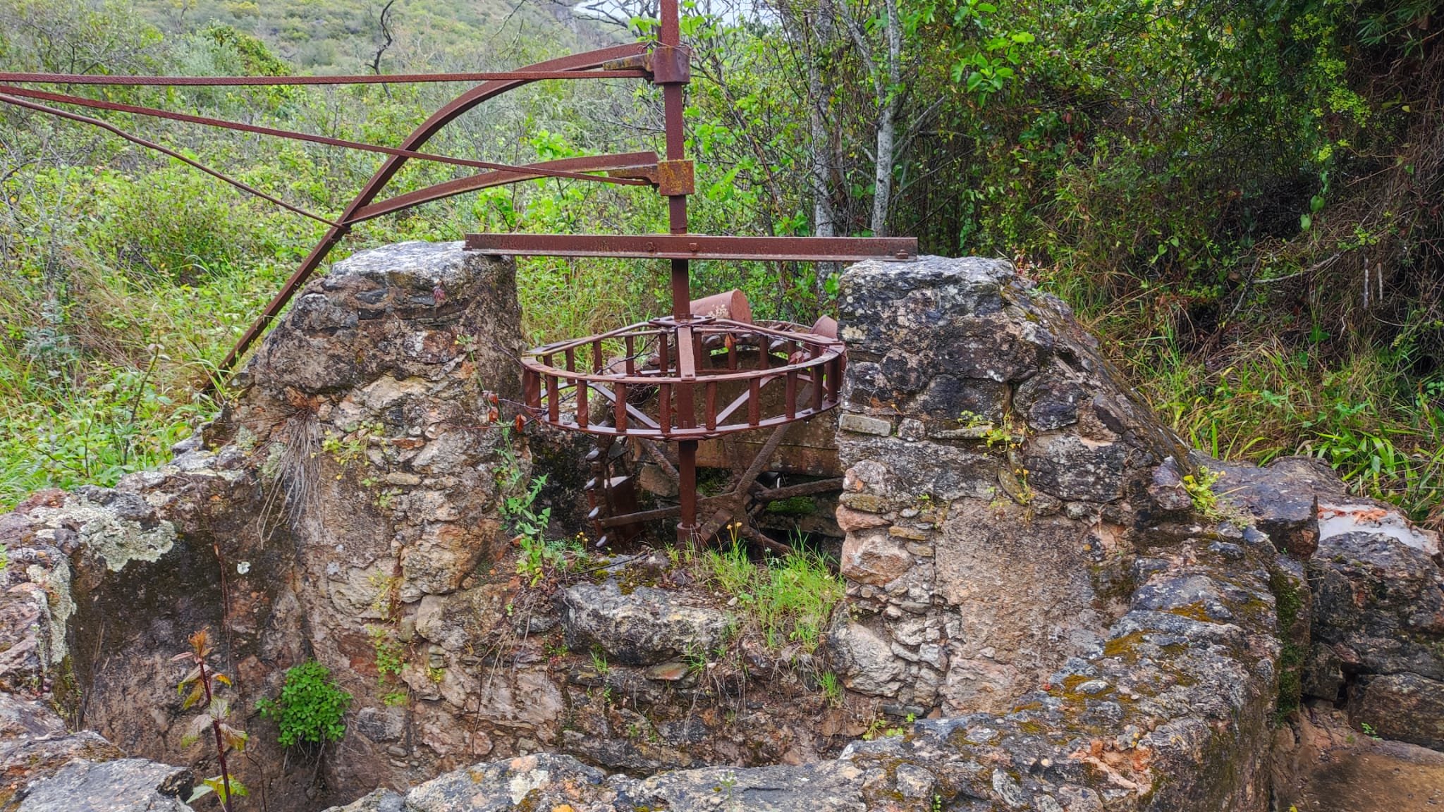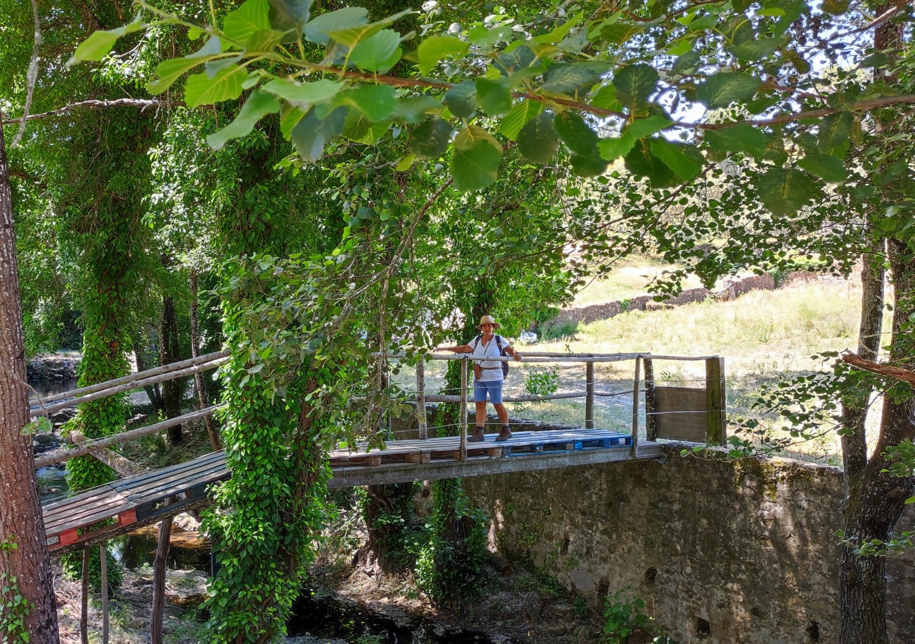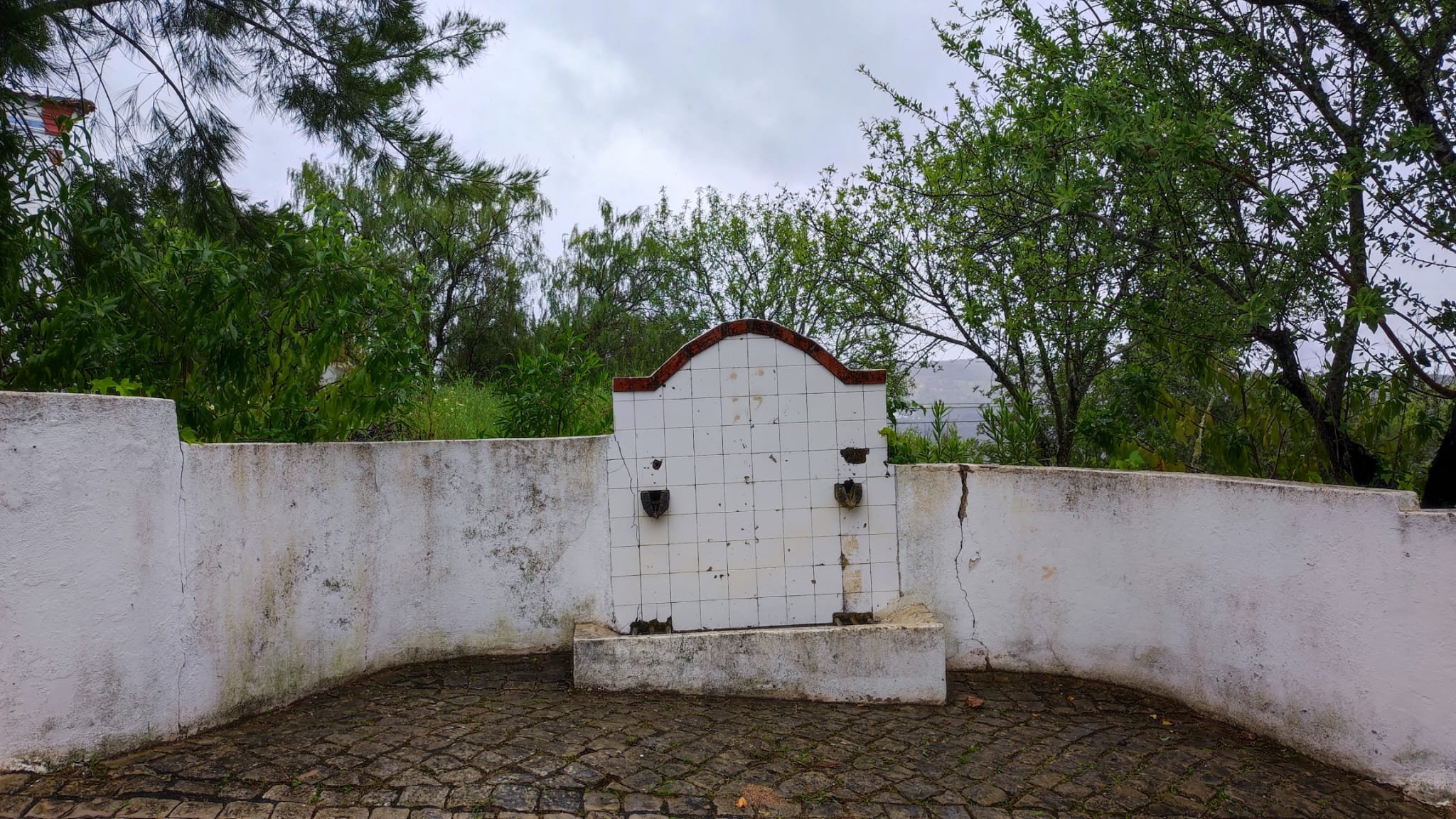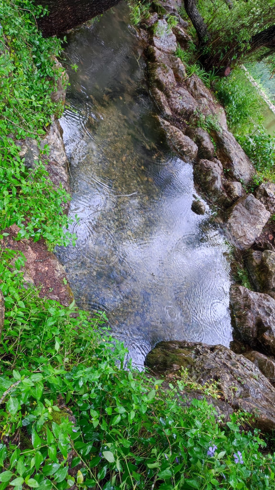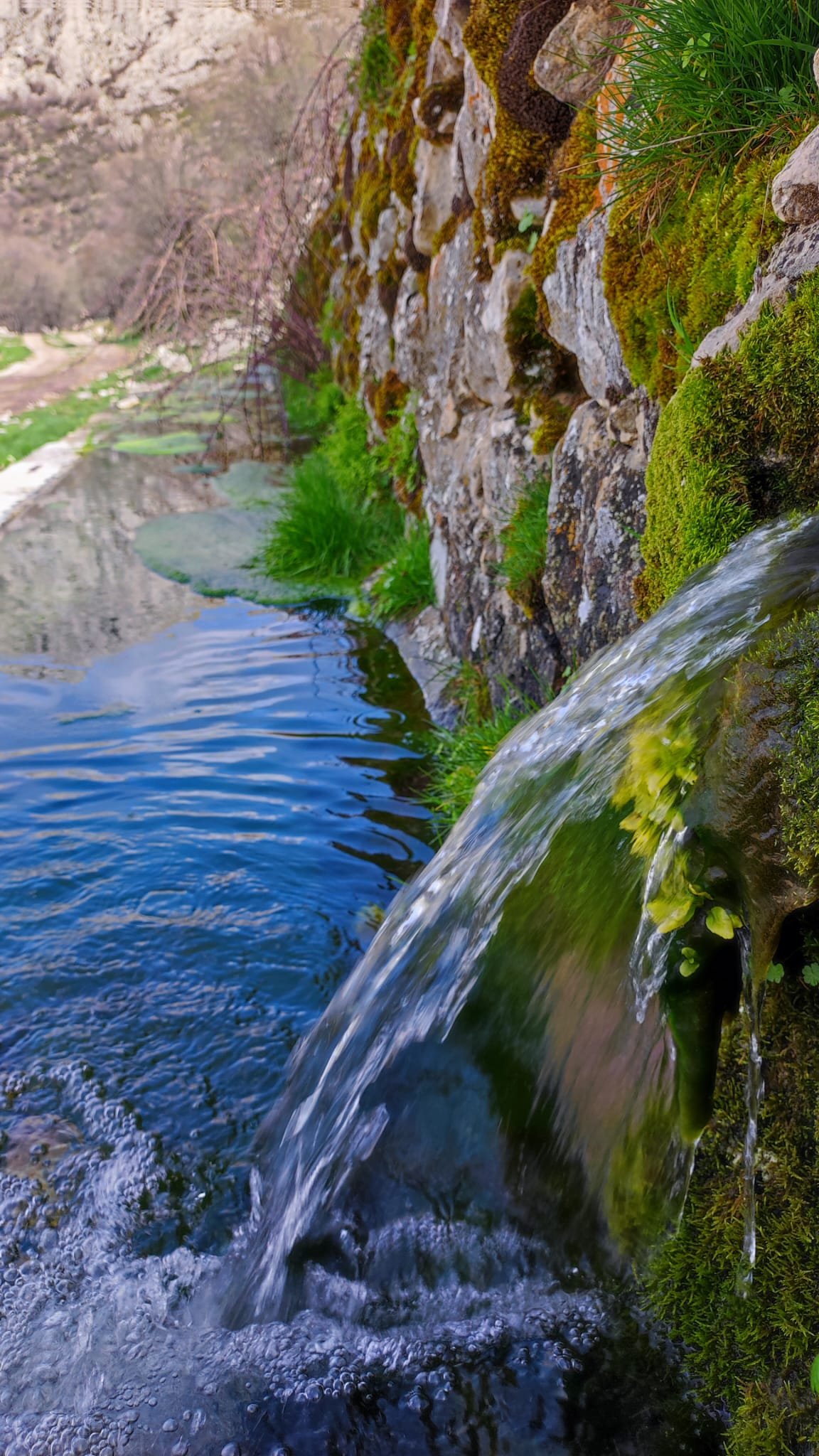 A partir de este punto seguimos un estrecho sendero junto a las aguas del embalse de derivación entre una vegetación propia del bosque mediterráneo mediatizada por presencia de las aguas del embalse. La encina es el árbol más abundante, junto con los acebuches, los jarales y algunos eucaliptus de gran porte. Entre la fauna, vemos algunos buitres leonados, alguna cigüeña negra y el canto de los jilgueros y el arrullo de las palomas. Es tierra de linces, pero lo frecuentado del sendero hace imposible su avistamiento. Hacia el km 5 de nuestro camino llegamos a la fuente de la amistad, el amor y la suerte que marca el comienzo de la pequeña ascensión. Es una fuente con tres caños nombrados de la amistad, del amor y de la suerte. Hoy no era el día del amor ya que de ese caño no manaba agua.