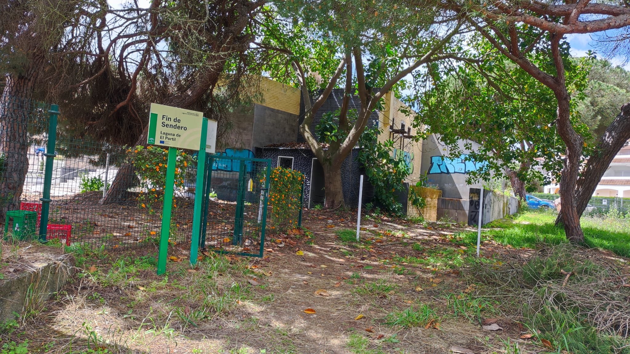 Comenzamos a descender por un camino asfaltado siguiendo las indicaciones del Sendero de los Ángeles en dirección al embarcadero cercano a la presa de derivación del Bembézar. Al cmienzo del camino pasaremos por el paraje de las Cuevas de las Carretas, unos tajos con oquedades en la parte inferior que fueron utilizadas como establos y para guardar los aperos de labranza. Actualmente hay una amplia colonia de golondrinas y vencejos que maravillan con sus vertiginosos vuelos. Un poco más adelante veremos la fuente del Caño de Hierro, un abrevadero con un pilar. La fuente es citada por Ramírez de las Casas en el siglo XIX indicando sobre ella que «la llamada caño de hierro está a la bajada de la villa y al pie del elevado cerro frontero que dicen de Las Erillas» Continuamos por el paraje Huertas del Granaillo hasta llegar al nivel del agua de la presa. El sendero propiamente dicho comienza en este punto, pasando detrás de la caseta de la acometida de aguas.