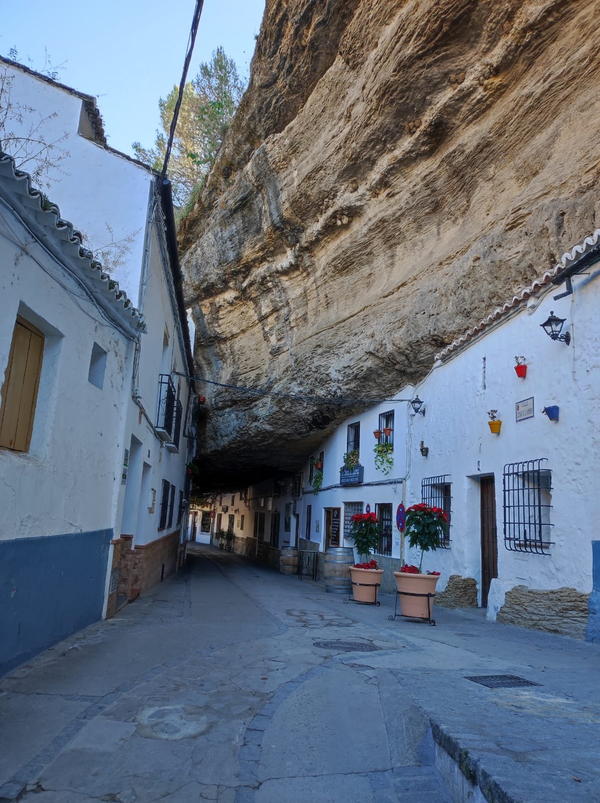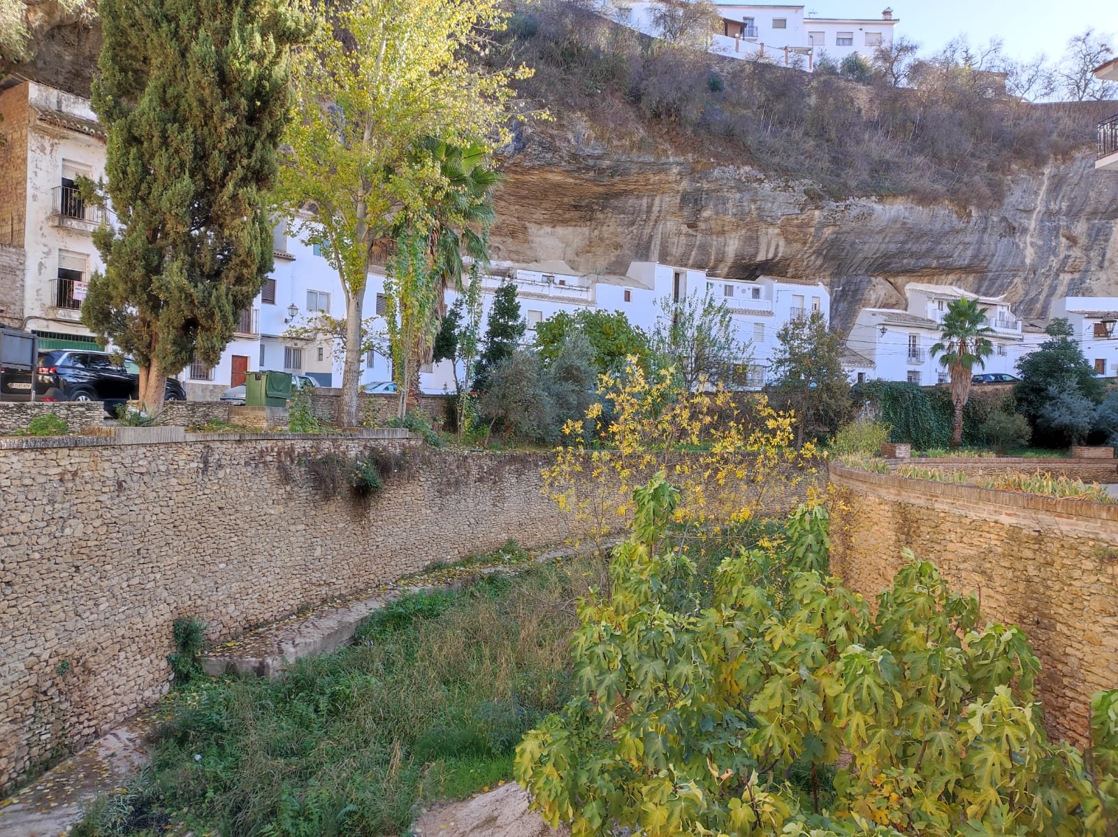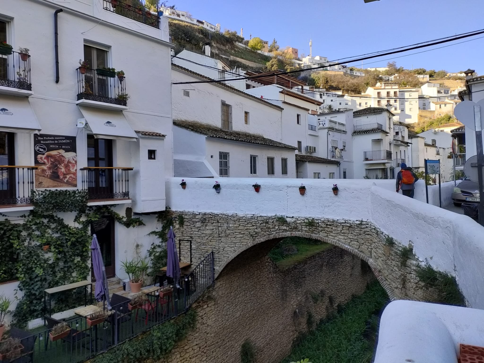 La mañana estaba bastante fría, así que comenzamos haciendo un poco de turismo por Setenil. A esa hora aún no había demasiados visitantes y pasear era un placer. Una vez visitadas las calles del Sol y de la Sombra y la ermita del Carmen. Bajamos hacia la Calle Jabonería y de ésta hacia la calle Cabrerizos por la que saldremos del pueblo. En el cruce antes del puente sobre el Guadalporcún (o Trejo como lo llaman aquí) veremos unas indicaciones hacia la ruta de los molinos.
