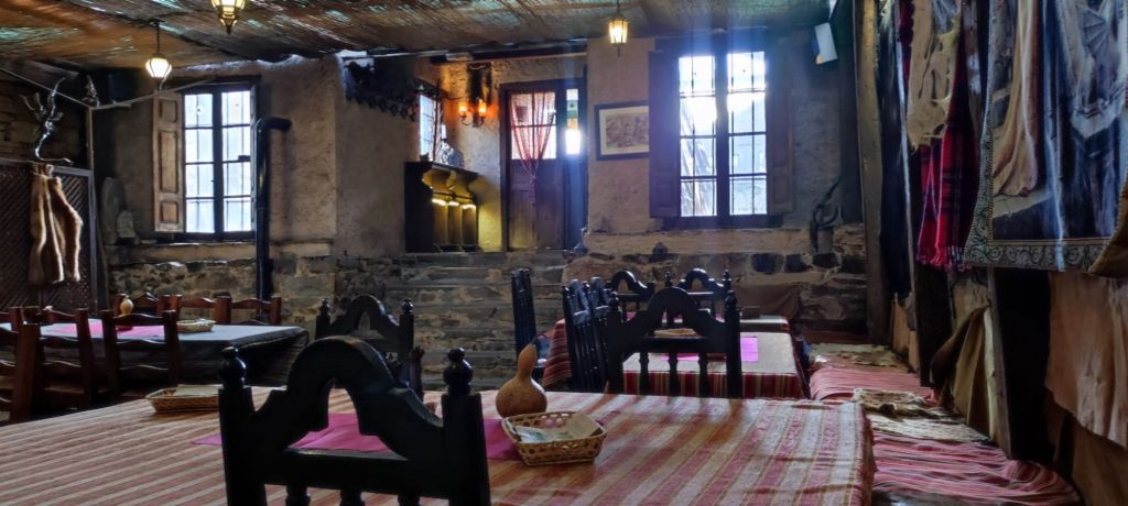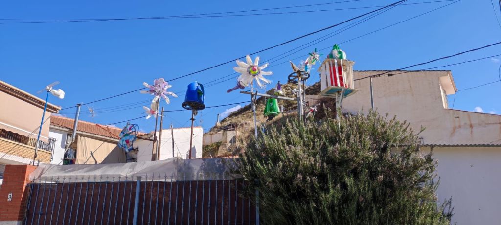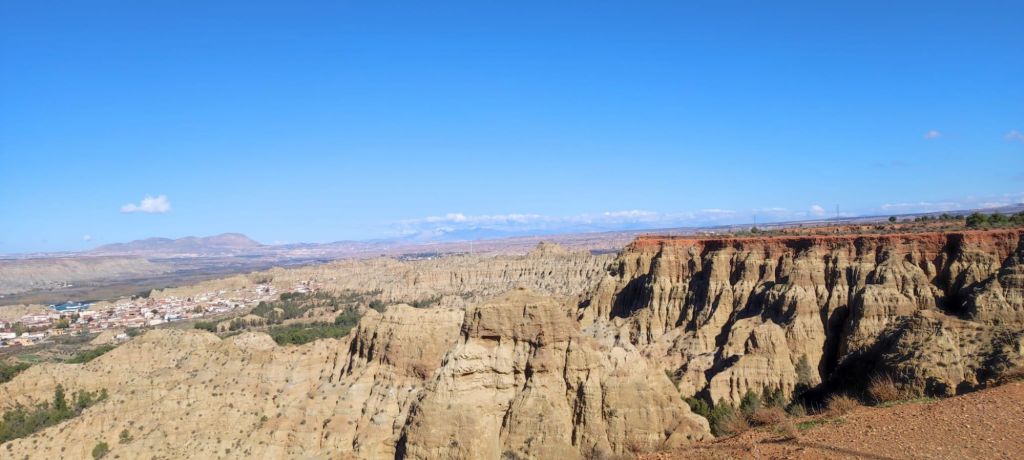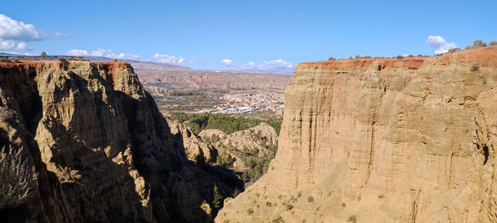 Lo seguimos para enlazar con un carril descendente que nos emplazará en las antiguas corraletas de Haza de la Meina o Corrales de la Soleta. Desde aquí se domina una magnífica panorámica del pueblo de Aldeire y su valle, con los Llanos del Marquesado al fondo. Seguimos nuestro descenso caminando por un tomillar, con el Barranco de los Tejos a la izquierda y el Barranco de los Pasillos a la derecha, hasta llegar al Horcajo (unión de los dos arroyos) donde confluyen ambas corrientes de agua formando el río Benéjar. En este fresco paraje ya podemos apreciar una abundante vegetación de ribera entre la que destacan álamos, alisos y sauces. Continuamos el descenso por un sendero junto al río Benéjar y que nos llevará a cruzarlo en un par de ocasiones. La vegetación de ribera se ve ahora salpicada por grandes e impresionantes castaños En un par de kilómetros nos encontraremos ante un bonito puente colgante que nos dejará a la entrada del área recreativa La Rosandrá emplazada entre castaños centenarios de extraordinaria belleza e interesante historia. Desde aquí solo resta continuar por el carril que conduce a Aldeire y llegaremos en unos minutos al Barranco de la Luna y, por la calle Real llegamos a las inmediaciones de la iglesia de Aldeire, punto final de nuestro recorrido.