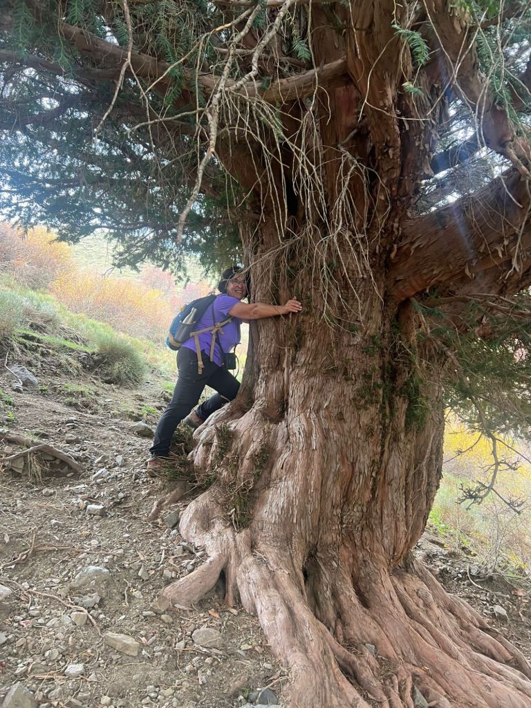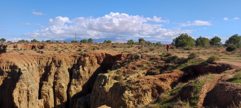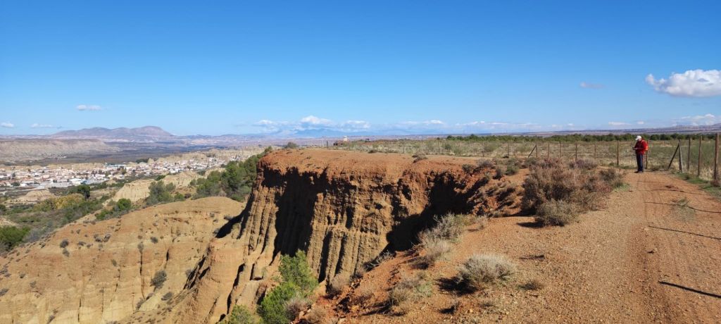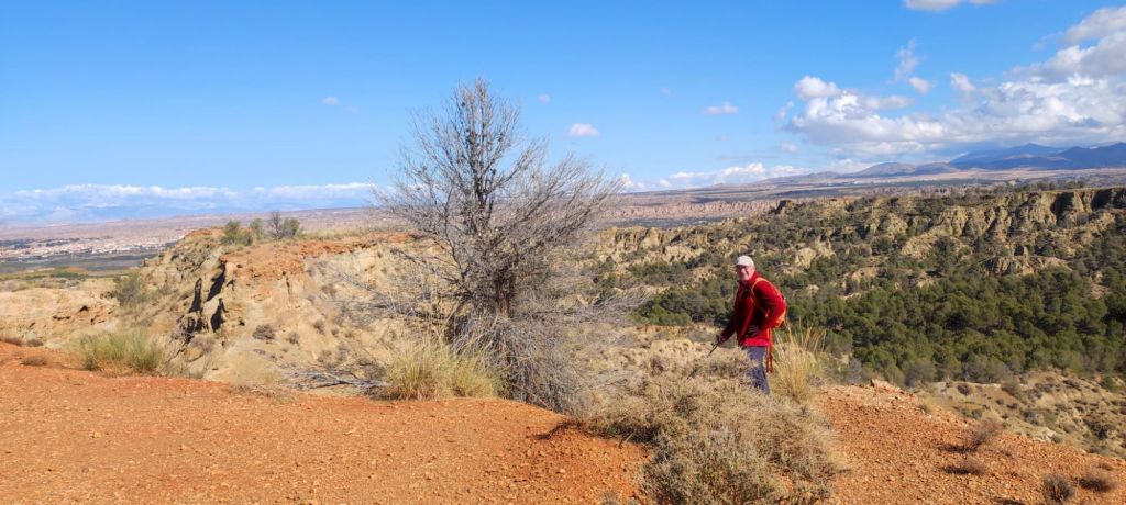 Salimos al carril ( también conocido como pista perimetral del Marquesado o Transnevada BTT) es un camino ideal para ciclistas, y en este punto ya tenemos unas vistas impresionantes del valle que hemos dejado abajo donde podemos ver Aldeire, El Castilllo de la Calahorrra y la sierra de Baza al fondo. A nuestra derecha vemos algunos de los «tresmiles » más orientales de Sierra Nevada: El Picón de Jérez, la cuerda de los morrones de Hornillo, Mediodía, San Juan, etc. Avanzando por este camino encontraremos un desvío a la izquierda que nos llevaría a Aldeire por el el Cerro de las Cruces. En esta ocasión continuamos hasta el barranco de los Tejos en el que podemos admirar un grupo de Secuoyas rojas (Sequoia sempervirens) una conífera siempreverde que pueden llegar a superar los 100 metros de altura. Continuamos por el Carril unos 800 metros hasta llegar a un punto en el que vemos las balizas del sendero PR-A-333 Puerto de la Ragua – Aldeire.